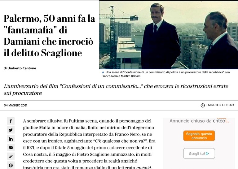 50 anni fa la “fantamafia” di Damiani che incrociò il delitto Scaglione, in la Repubblica/Cultura