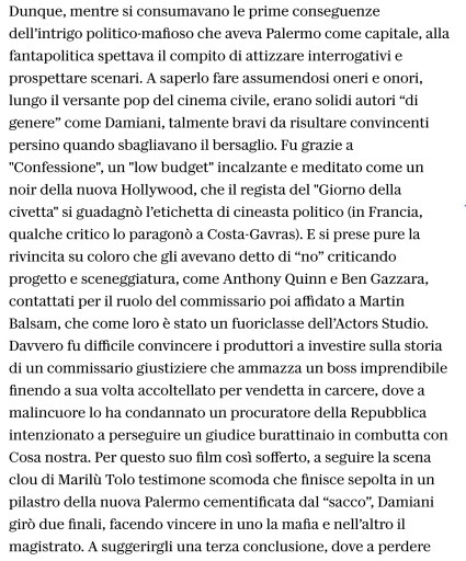 A saperlo fare assumendosi oneri e onori, lungo il versante pop del cinema civile, erano solidi autori “di genere” come Damiani, talmente bravi da risultare convincenti persino quando sbagliavano il bersaglio. Fu grazie a Confessione, un low budget incalzante e meditato come un noir della nuova Hollywood, che il regista del Giorno della civetta si guadagnò l’etichetta di cineasta politico (in Francia, qualche critico lo paragonò a Costa-Gavras).