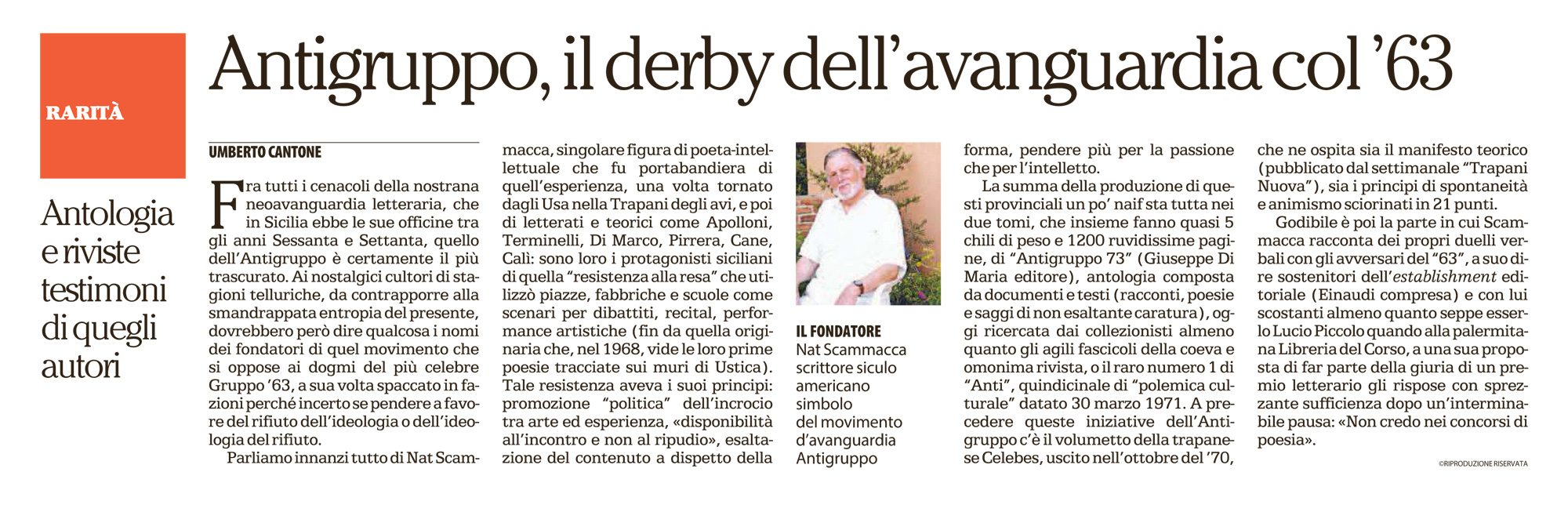 Fra tutti i cenacoli della nostrana neoavanguardia letteraria, che in Sicilia ebbe le sue officine tra gli anni Sessanta e Settanta, quello dell’Antigruppo è certamente il più trascurato. Ai nostalgici cultori di stagioni telluriche, da contrapporre alla smandrappata entropia del presente, dovrebbero però dire qualcosa i nomi dei fondatori di quel movimento che si oppose ai dogmi del più celebre Gruppo ’63, a sua volta spaccato in fazioni perché incerto se pendere a favore del rifiuto dell’ideologia o dell’ideologia del rifiuto. Parliamo innanzi tutto di Nat Scammacca (1924-2005), singolare figura di poeta-intellettuale che fu portabandiera di quell’esperienza, una volta tornato dagli Usa nella Trapani degli avi, e poi di letterati e teorici come Apolloni, Terminelli, Di Marco, Pirrera, Cane, Calì: sono loro i protagonisti siciliani di quella “resistenza alla resa” che utilizzò piazze, fabbriche e scuole come scenari per dibattiti, recital, performance artistiche (fin da quella originaria che, nel 1968, vide le loro prime poesie tracciate sui muri di Ustica). Tale resistenza aveva i suoi principi: promozione “politica” dell’incrocio tra arte ed esperienza, “disponibilità all’incontro e non al ripudio”, esaltazione del contenuto a dispetto della forma, pendere più per la passione che per l’intelletto. La summa della produzione di questi provinciali un po’ naif sta tutta nei due tomi, che insieme fanno quasi 5 chili di peso e 1200 ruvidissime pagine, di “Antigruppo 73” (Giuseppe Di Maria editore), antologia composta da documenti e testi (racconti, poesie e saggi di non esaltante caratura), oggi ricercata dai collezionisti almeno quanto gli agili fascicoli della coeva e omonima rivista, o il raro numero 1 di “Anti”, quindicinale di “polemica culturale” datato 30 marzo 1971. A precedere queste iniziative dell’Antigruppo c’è il volumetto della trapanese Celebes, uscito nell’ottobre del ’70, che ne ospita sia il manifesto teorico (pubblicato dal settimanale “Trapani Nuova”), sia i principi di spontaneità e animismo sciorinati in 21 punti. Godibile è poi la parte in cui Scammacca racconta dei propri duelli verbali con gli avversari del “63”, a suo dire sostenitori dell’establishment editoriale (Einaudi compresa) e con lui scostanti almeno quanto seppe esserlo Lucio Piccolo quando alla palermitana Libreria del Corso, a una sua proposta di far parte della giuria di un premio letterario gli rispose con sprezzante sufficienza dopo un’interminabile pausa: “Non credo nei concorsi di poesia”. E questo sotto lo sguardo divertitissimo di Leonardo Sciascia che di quella giuria era il presidente.