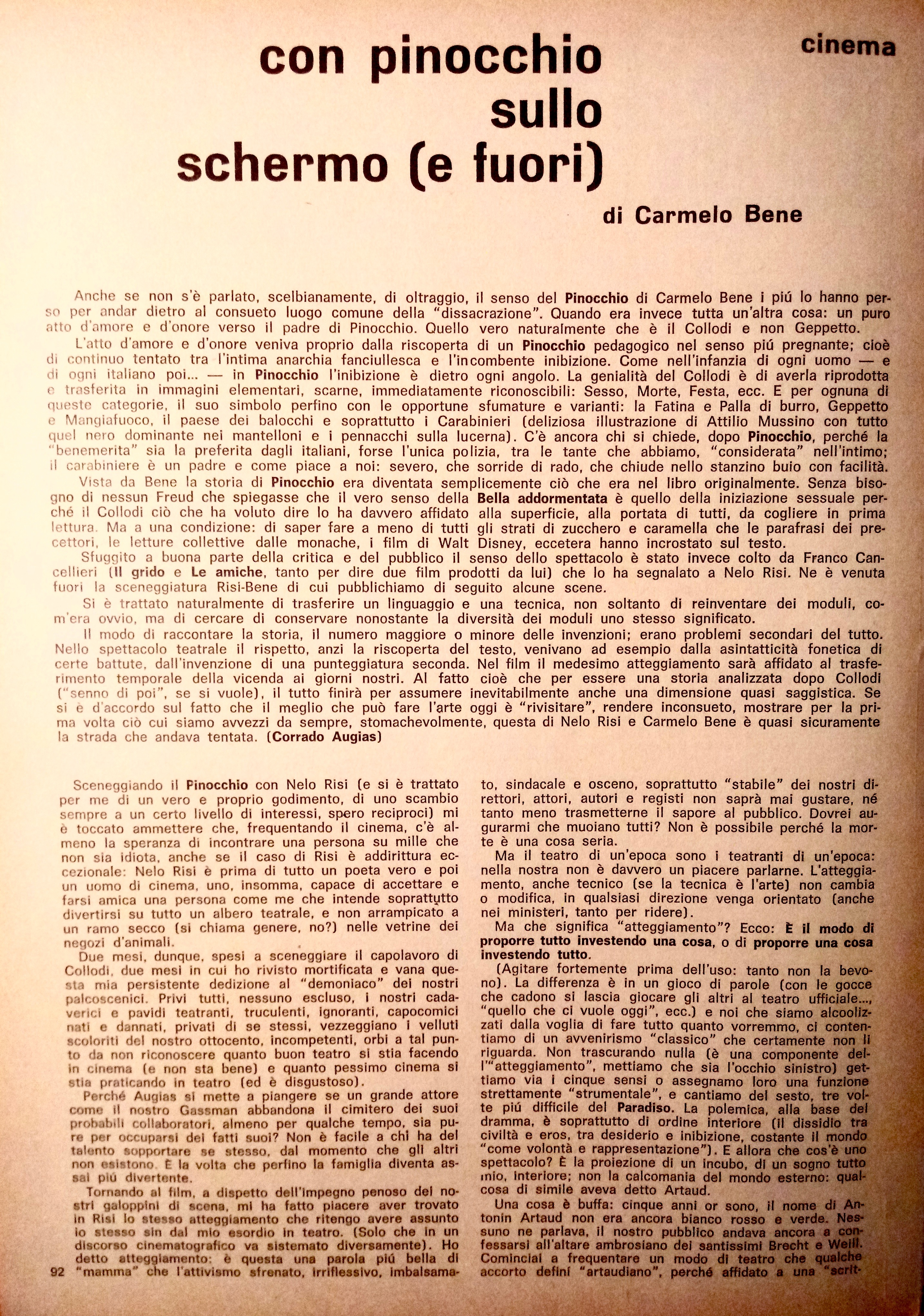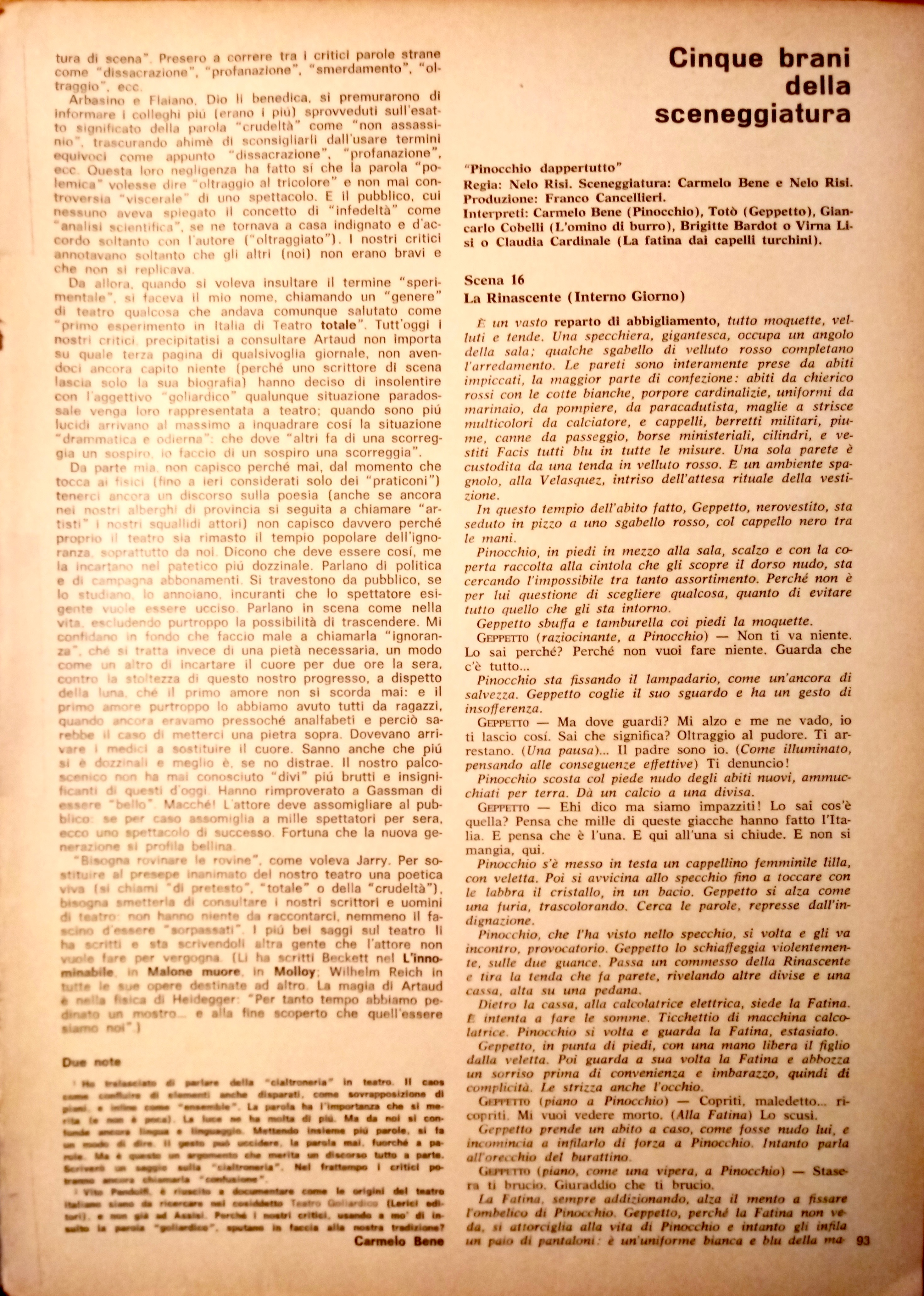 Carmelo Bene: Con Pinocchio sullo schermo (e fuori), frammenti della sceneggiatura scritta con Nelo Risi, in “Sipario”, n. 244-245, agosto-settembre 1966