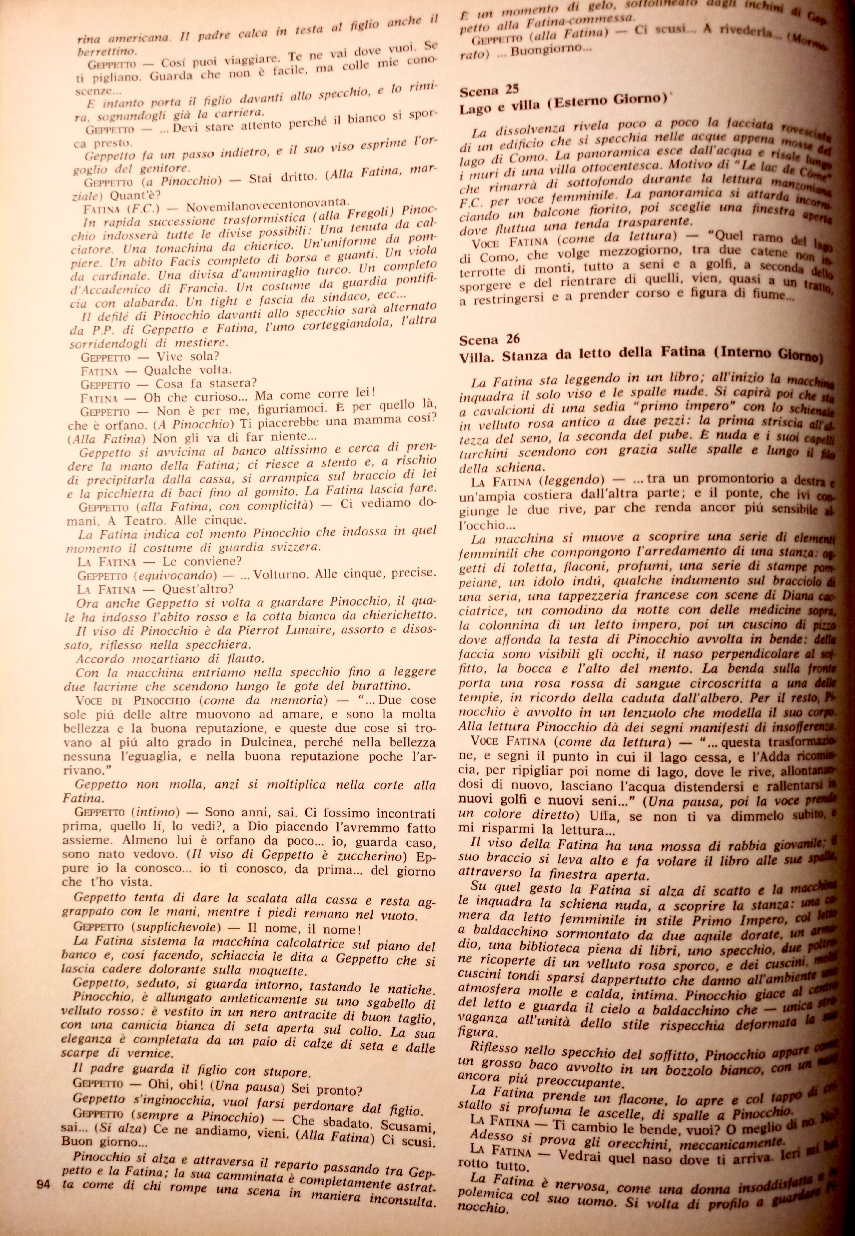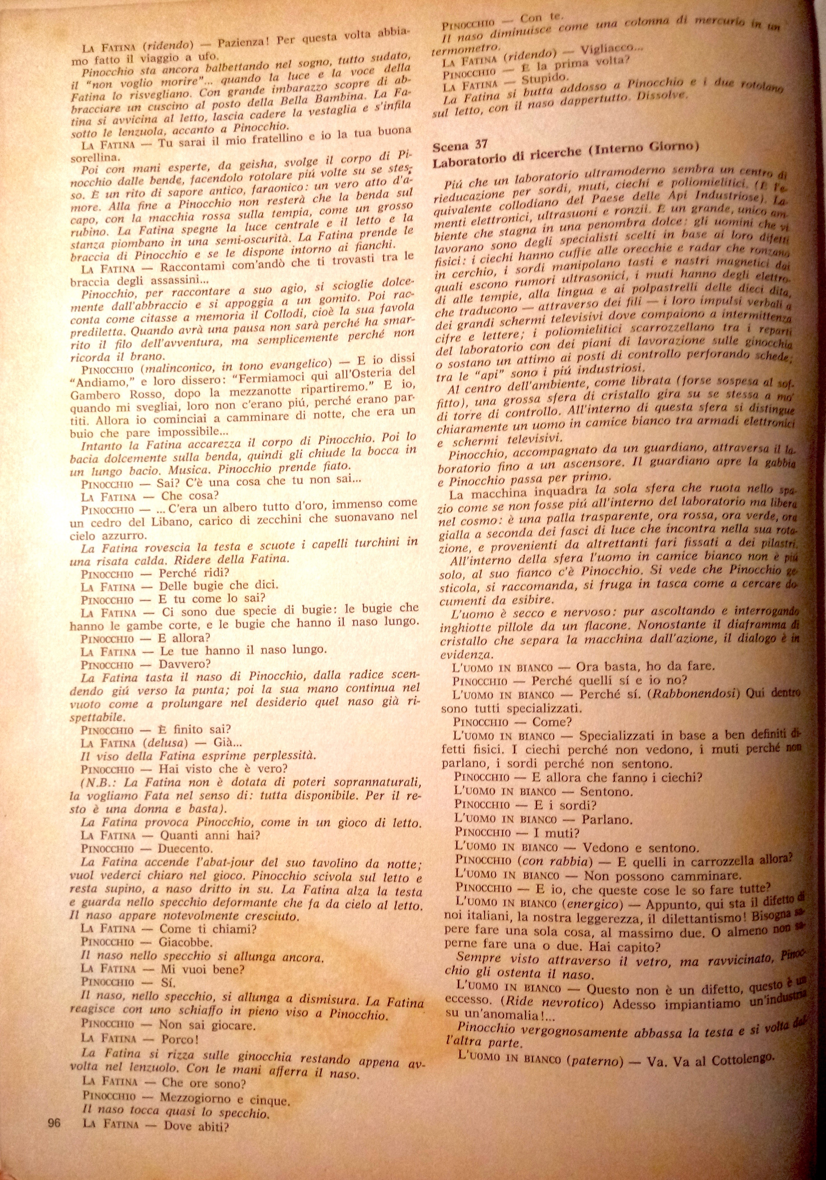« Sceneggiando il Pinocchio con Nelo Risi (e si è trattato per me di un vero e proprio godimento, di uno scambio sempre a un certo livello di interessi, spero reciproci) mi è toccato ammettere che, frequentando il cinema, c’è almeno la speranza di incontrare una persona su mille che non sia idiota, anche se il caso di Risi è addirittura eccezionale: Nelo Risi è prima di tutto un poeta vero e poi un uomo di cinema, uno, insomma, capace di accettare e farsi amica una persona come me che intende soprattutto divertirsi su tutto un albero teatrale, e non arrampicato a un ramo secco (si chiama genere, no?) nelle vetrine dei negozi d’animali. Due mesi, dunque, spesi a sceneggiare il capolavoro di Collodi, due mesi in cui ho rivisto mortificata e vana questa mia persistente dedizione al “demoniaco” dei nostri palcoscenici. Privi tutti, nessuno escluso, i nostri cadaverici e pavidi teatranti, truculenti, ignoranti, capocomici nati e dannati, privati di se stessi, vezzeggiano i velluti scoloriti del nostro ottocento, incompetenti, orbi a tal punto da non riconoscere quanto buon teatro si stia facendo in cinema (e non sta bene) e quanto pessimo cinema si stia praticando in teatro (ed è disgustoso). (…)