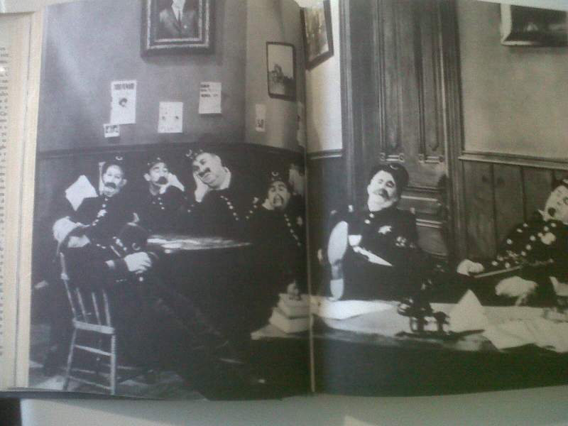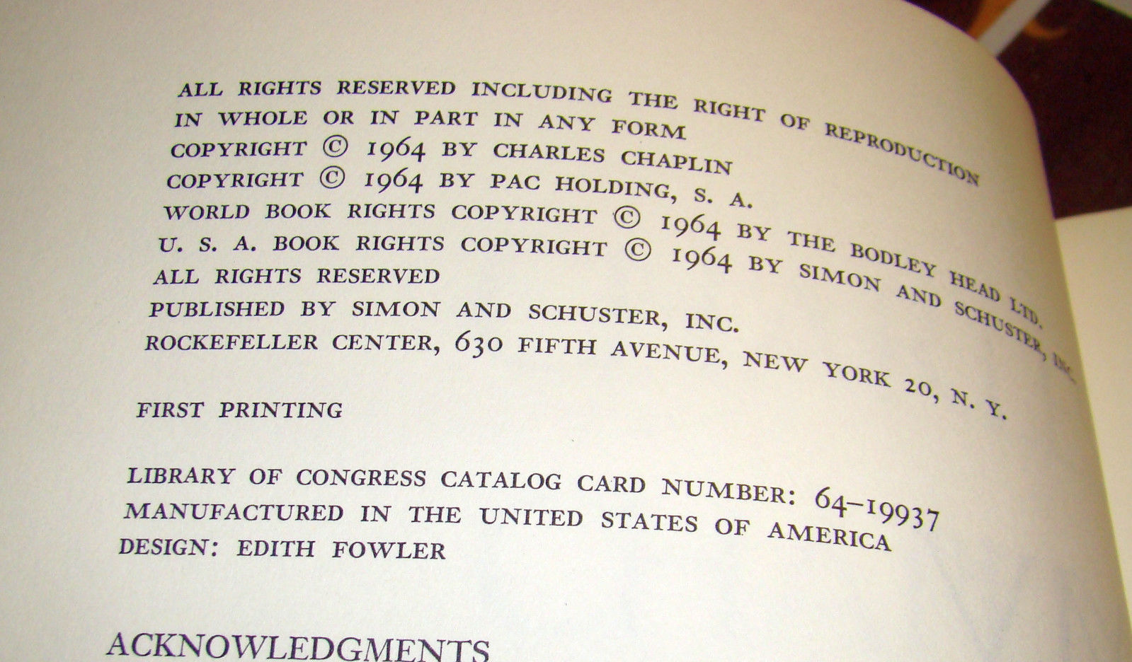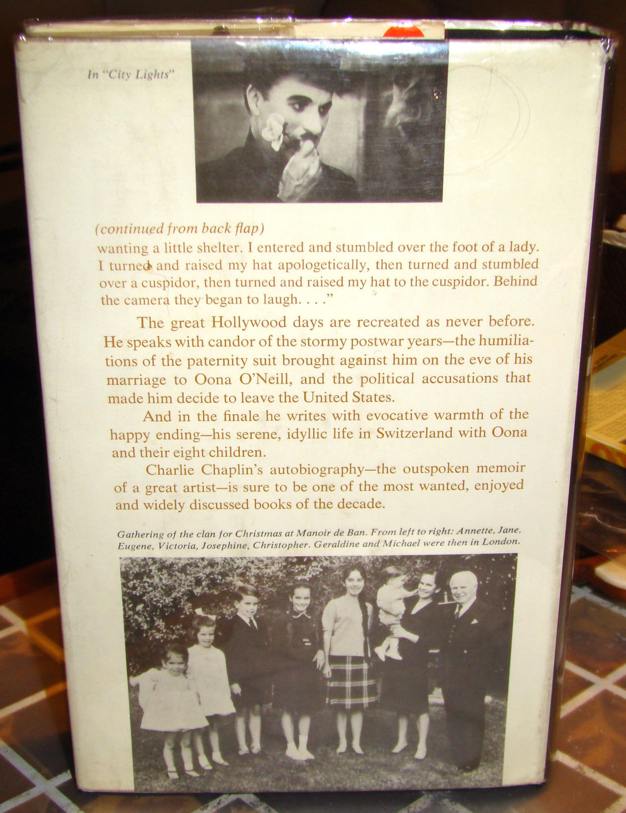 Caratteristiche:  Legatura in tela di colore rosso porpora con titoli color oro al dorso, sopraccoperta con composizione fotografica (due ritratti a specchio di Chaplin), titoli in blu, rosso e nero su fondo bianco. Con all'interno 114 illustrazioni fotografiche in bianco e nero