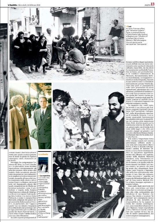 Una monografia delle Edizioni Lussografica che colma un vuoto sull’argomento presentandosi come un vero e proprio atlante della palermitaneità a misura di grande schermo. Un volume ponderoso e utile il cui suggestivo racconto tra il critico e l’aneddotico, abbondantemente illustrato da materiali iconografici spesso inediti, si declina in prospettiva storiografica per interrompersi sulla soglia del millennio corrente raccogliendo, attraverso 14 capitoli e 165 film censiti, le suggestioni delle tante esperienze di autori e di tendenze avvicendatesi a esplorare il frastagliato territorio socio-culturale della Sicilia messa a fuoco specialmente da quel cinema che ne ha saputo restituire un’immagine allusiva a “un più dell’Italia e un diverso”, come scrive Goffredo Fofi nel suo bel prologo.