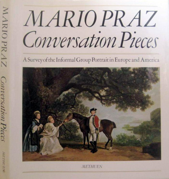 Prima edizione inglese di Conversation Pieces (Scene di conversazione) di Mario Praz, pubblicata nel 1971 da Methuen & Co di Londra. Questa edizione è coeva a quella italiana, pubblicata a Roma da Ugo Bozzi Editore. È stata realizzata a Milano dalla I.T.E.C. di R. Olivieri con la collaborazione della Fotoincisioni d’Arte di Roma e della Legatoria Torriani. L’edizione della Bozzi, oltre alla tiratura ordinaria, ne prevedeva alcune ad personam rilegate in pelle. Il volume contiene 380 riproduzioni in nero e a colori (182 delle quali a piena pagina o nel testo, e il resto nell’apparato in coda al testo, 31 a colori) di dipinti, bassorilievi e sculture elencati, per ordine alfabetico, nell’indice. Alcune di queste opere appaiono nella galleria di questa scheda.