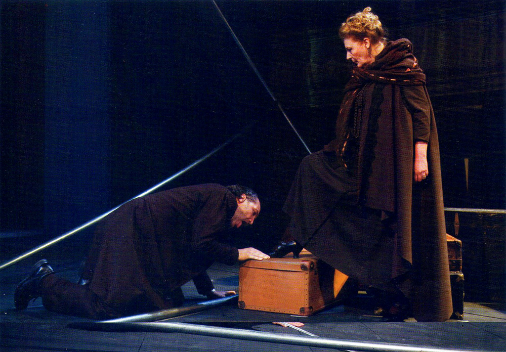 Nel nostro spettacolo, la scultura scenografica di Pietro Carriglio è lo scheletro di una prigione metafisica che proietta in platea il ring, assecondando la prospettiva drammaturgica sperimentata da Friedrich Dürrenmatt nella sua densa riscrittura di Danza macabra.