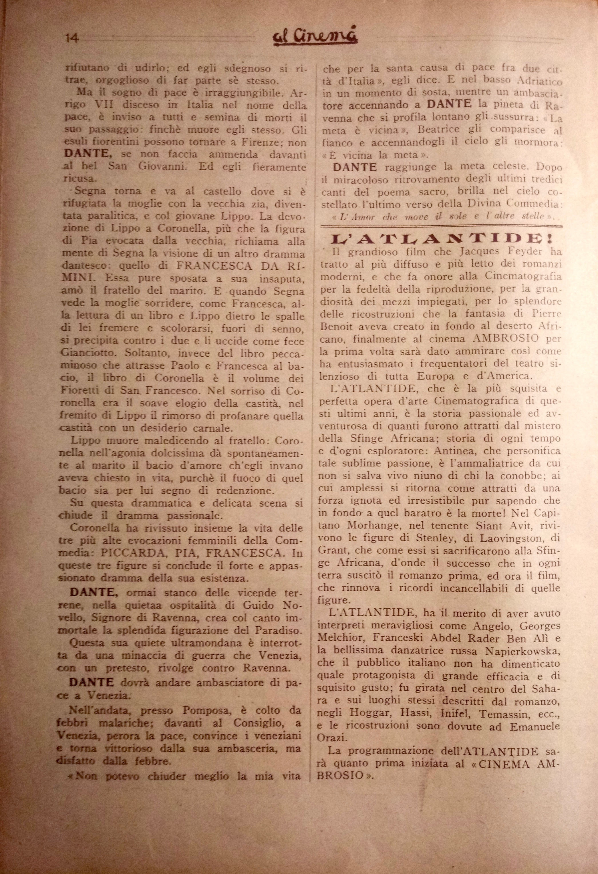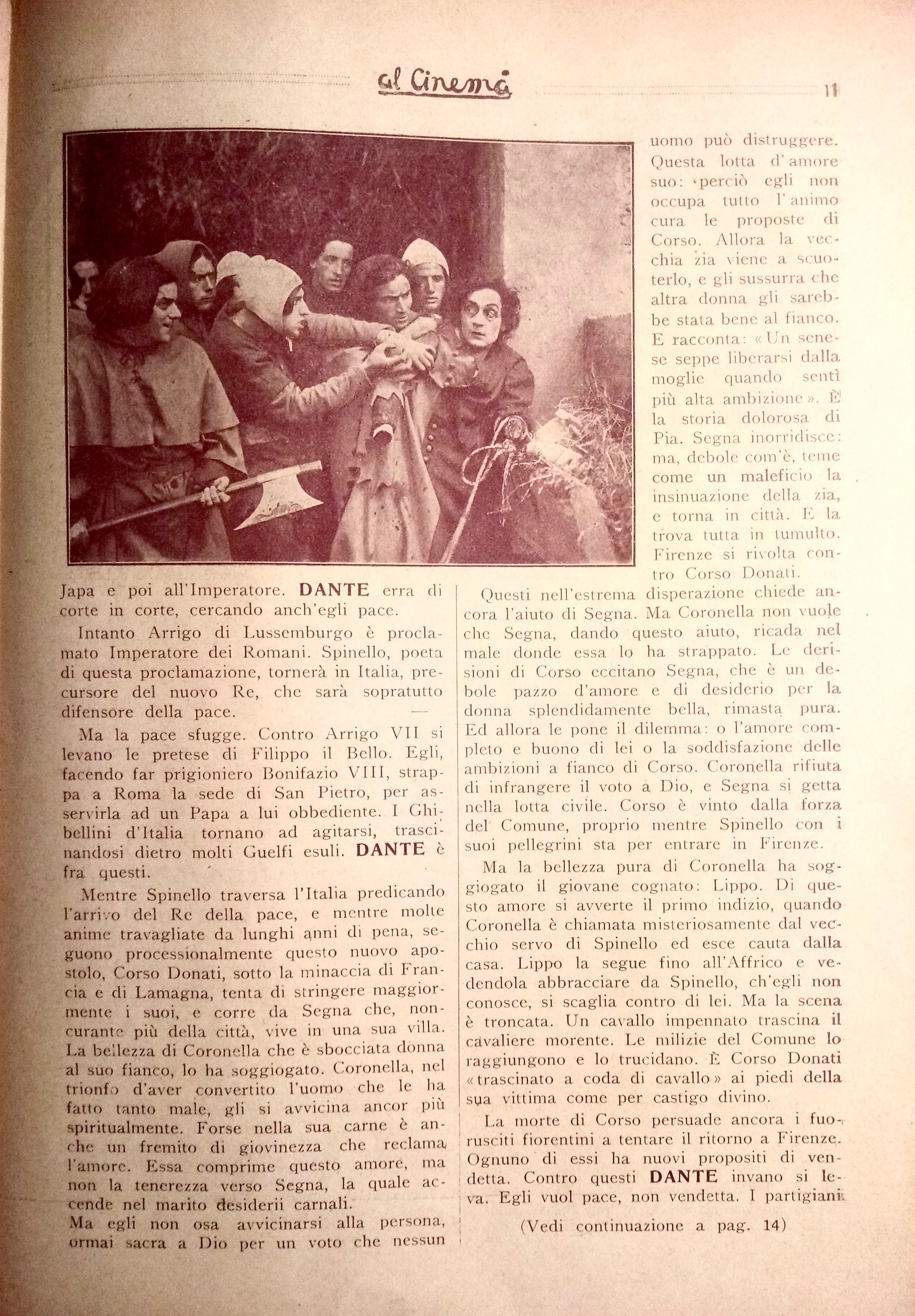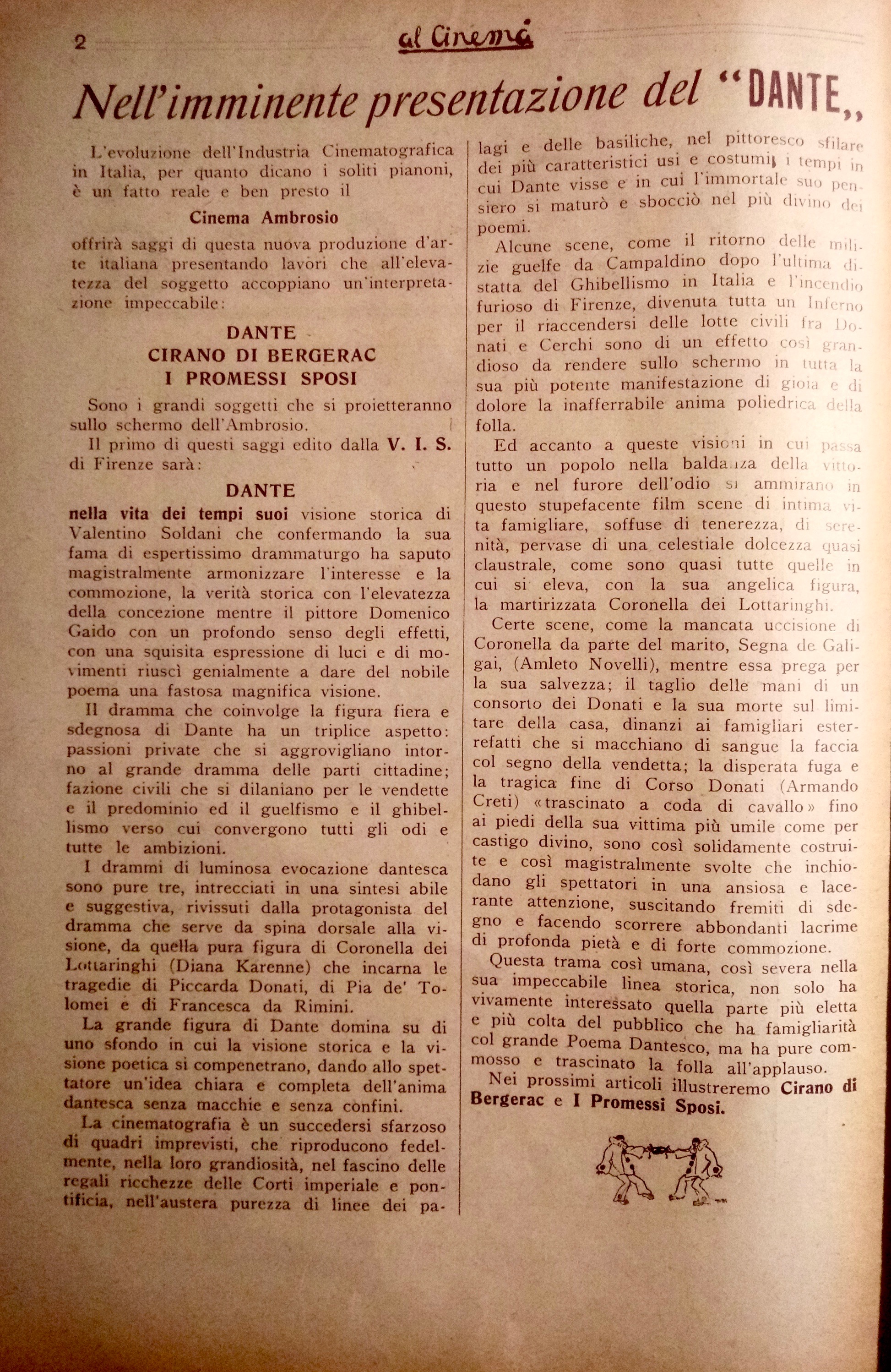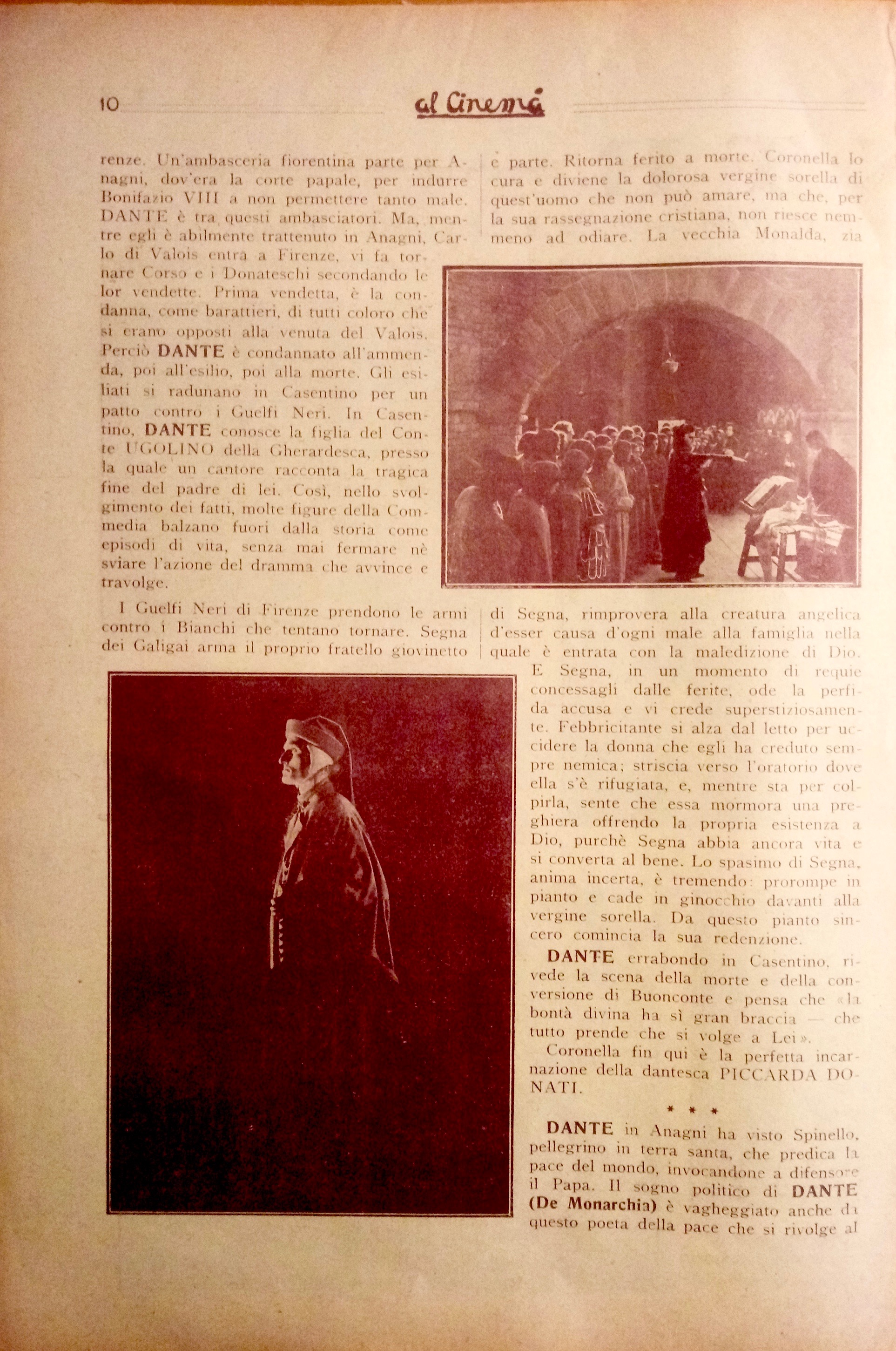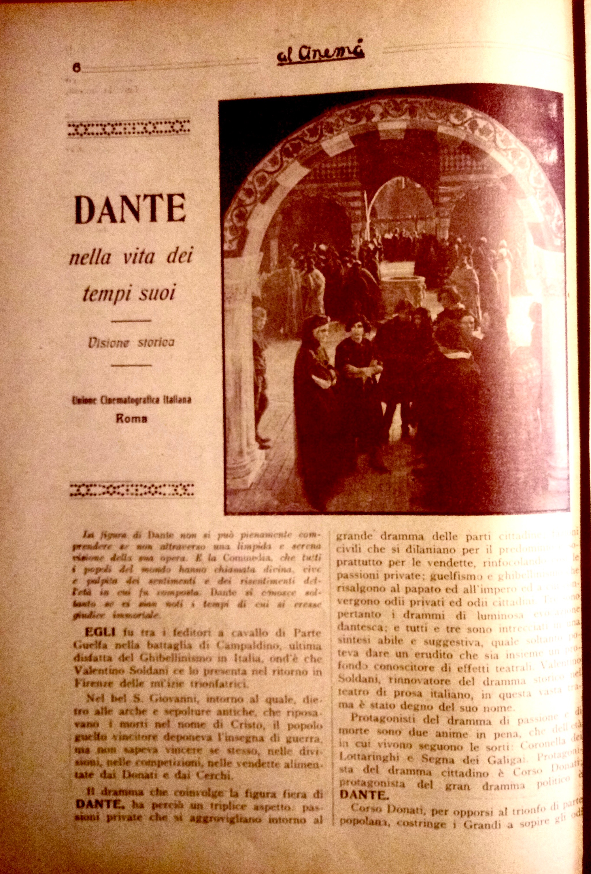 Tuttavia rimangono salvi tutti i valori ideali dell’opera. Ma non possiamo sottacere il nostro disappunto per l’abuso di alcuni simbolismi che appariscono troppo rudi e realistici. Quelle piogge di rose celesti, quelle apparizioni di angeli con ali di cartone o di demoni mascherati non possiamo approvarle. Ci sembrano di cattivo gusto, volgari ed oleografiche. (…) La sosta di Dante sotto il balcone di Beatrice ormai sposata, mentre i ricordi dell’infanzia e della giovinezza lo assalgono, dura un po’ troppo e rende il poeta così smemorato lì sotto, alquanto ridicolo. È per lo meno inopportuno il momento in cui tutto ciò avviene. La materializzazione del sogno di Dante, di venir incoronato poeta nel bel San Giovanni, è urtante e sgradevole per la sua materializzazione.L’integramento delle figure e dei casi di Piccarda Donati, di Pia de’ Tolomei e di Francesca da Rimini, se bene rispondano ad illustrare il dramma umano, che si svolge in concordanza e in dipendenza col dramma civile dilaniante Firenze, con le lotte, cioè, delle fazioni e delle famiglie, rallenta l’azione e la rende prolissa e tediosa. L’identicità delle situazioni, l’analogia dei casi sminuiscono l’effetto che se ne voleva ricavare, scoprono l’espediente teatrale, il mezzuccio del loro collegamento. Nulla di meno le lotte partigiane dei Cerchi e dei Donati, le competizioni delle loro fazioni, logoranti e travaglianti Firenze, il dramma passionale di Coronella dei Lottaringhi e di Segna de’Calligai, e conseguenza di quelle, il tormento di Dante, la sua dolorosa passione per Firenze e per l’Italia, il suo profetico sogno dell’unità italica, ottengono un considerevole rilievo e formano la parte viva e vitale di tutto il film.