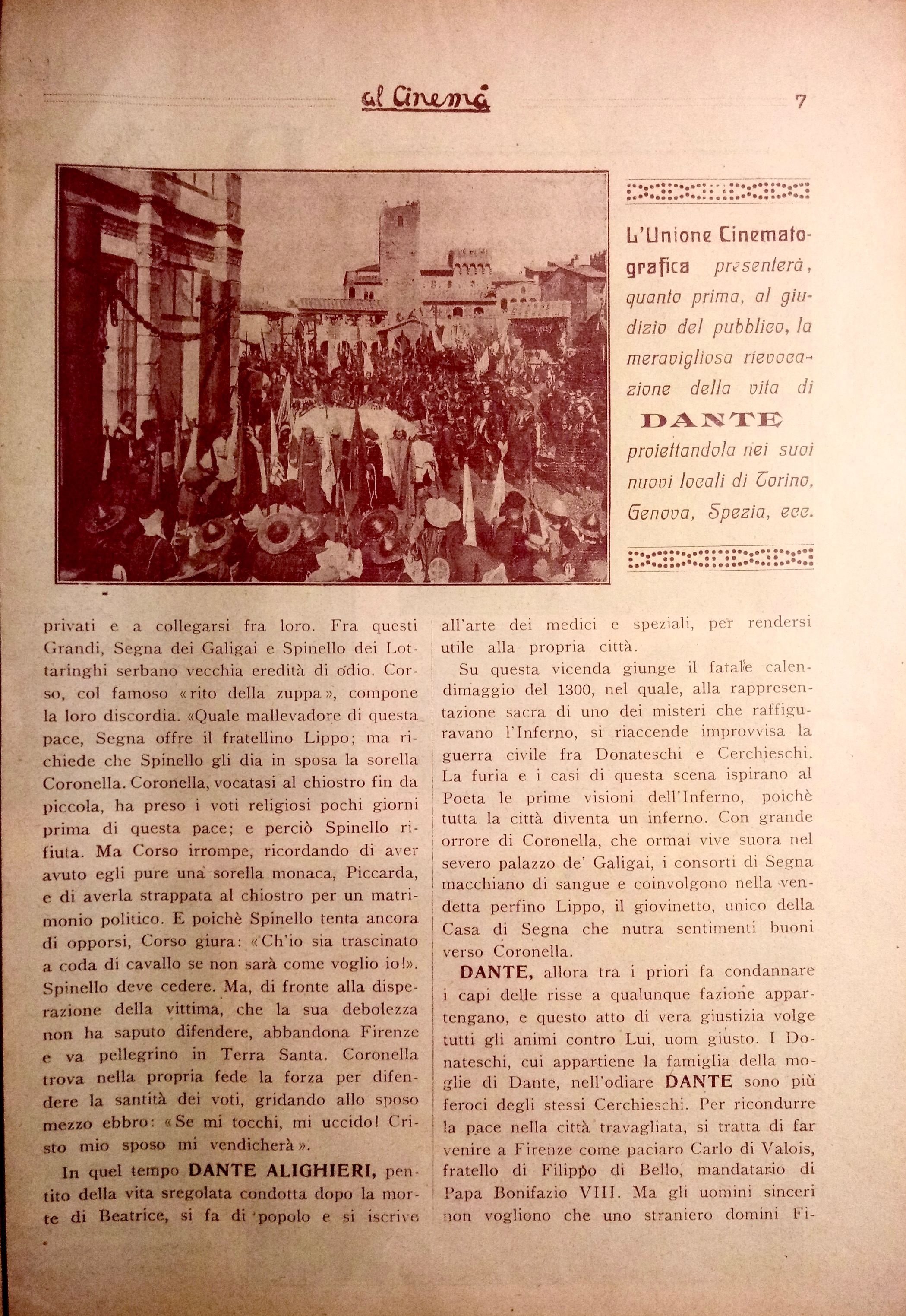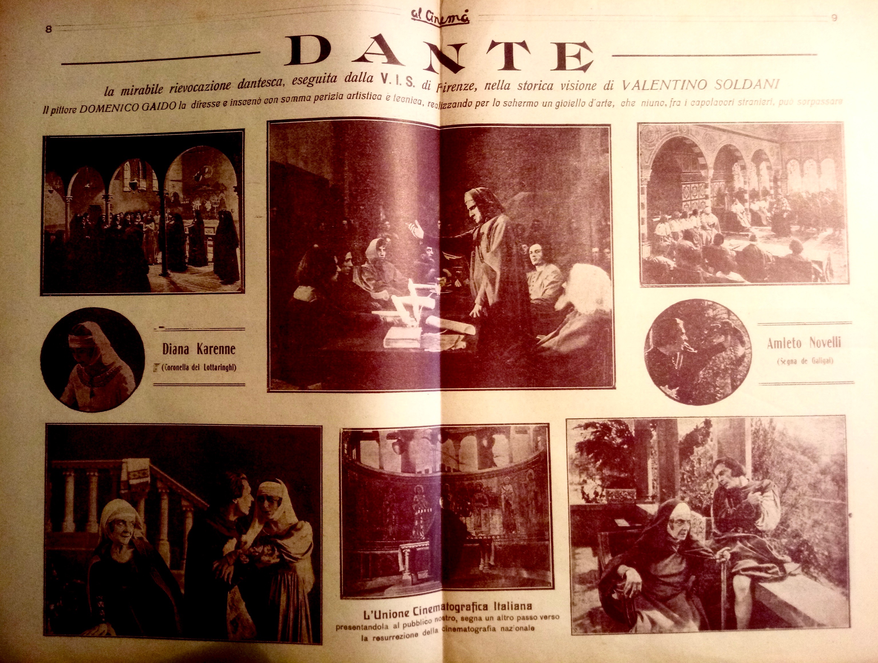 Film di riferimento:  Dante nella vita e nei tempi suoi (Italia, 1922) Regia di Domenico Gaido. Soggetto e sceneggiatura: Valentino Soldani. Fotografia: Carlo Montuori, Emilio Peruzzi. Scenografia: Giuseppe Castellucci (per le ricostruzioni architettoniche), Carlo Bonafede (interni, utensili, armi). Consulenza storica e letteraria: Guido Biagi, Isidoro Del Lungo, G. Lando Passerini. Interpreti: Guido Maraffi (Dante Alighieri), Amleto Novelli (Segna de'Calligai), Diana Karenne (Coronella dei Lottaringhi), Armando Cresti (Corso Donati), Celeste Paladini-Andò (Monalda de'Calligai), Vittorio Evangelisti (Lippo de'Calligai), Perla Lottini (Beatrice), Gino Soldarelli (Ristoro della Sarnella), Totò Lo Bue (Guido Novello), Eugenio Gilardoni (Conte Ugolino de la Gherardesca), Ruggero Barni (Spinello dei Lottaringhi), Gemma Donati (Fiamma Donati), Adriana Benvenuti (Costanza della Sarnella), Rodolfo Geri, Valentina Frascaroli