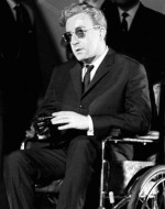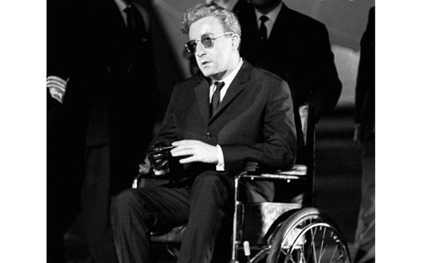 Fotografia di scena in bianco e nero di Dr.Strangelove…(1963) di Stanley Kubrick il cui soggetto è la scena finale del finale con il dr.Stranamore, interpretato da Peter Sellers, che abbandona la carrozzella nella War Room dopo l’apocalittico inizio della Guerra-Fine-di- Mondo. Si tratta di uno dei tanti stills set utilizzati per la promozione del film all’epoca della sua uscita. Questa copia reca l’autografo originale dell’attore protagonista Peter Sellers.