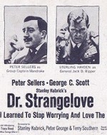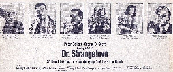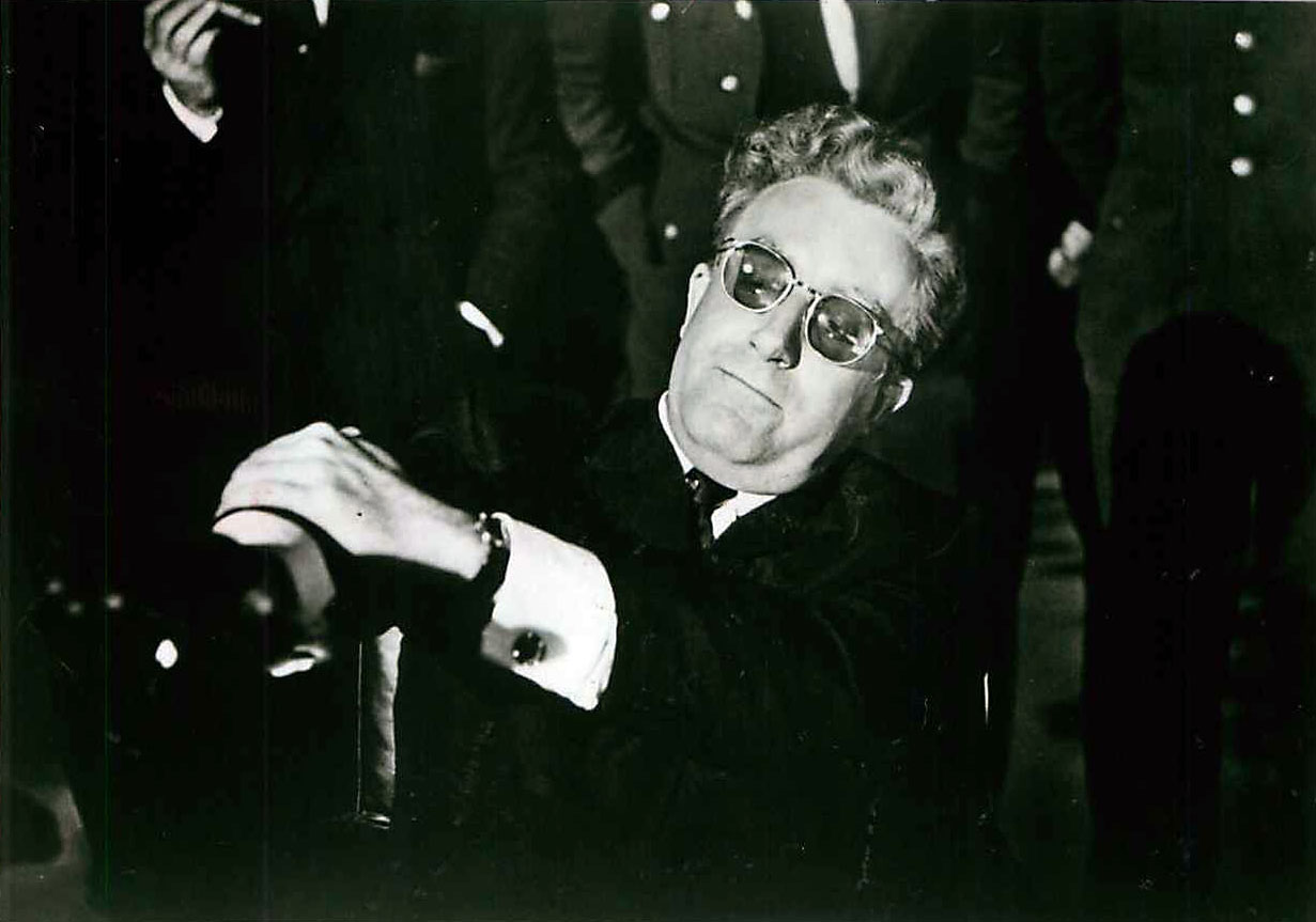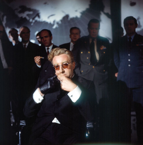 Film di riferimento:  Dr.Strangelove, or I Learned to Stop Worrying and Love the Bomb (Gran Bretagna/Stati Uniti, 1963) di Stanley Kubrick. Sceneggiatura di Stanley Kubrick, Terry Southern, Peter George, dal romanzo "Red Alert" di Peter George. Fotografia di Gilbert Taylor. Scenografia di Ken Adam. Musica di Laurie Johnson. Con Peter Sellers, George C.Scott, Sterling Hayden, Keenan Wynn, Slim Pickens, Peter Bull, Tracy Reed