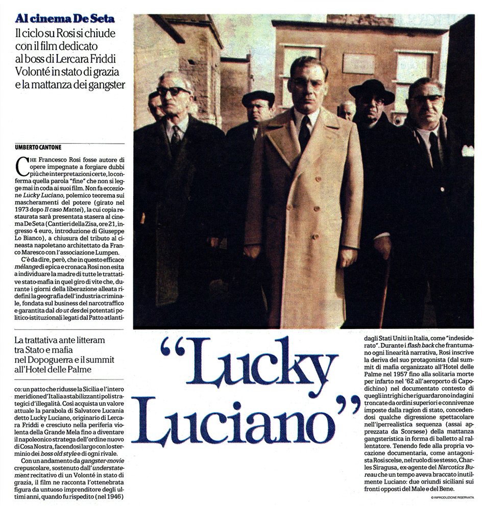 Che Francesco Rosi fosse autore di opere impegnate a forgiare dubbi più che interpretazioni certe, lo conferma quella parola «fine» che non si legge mai in coda ai suoi film. Non fa eccezione Lucky Luciano, polemico teorema sui mascheramenti del potere (girato nel 1973 dopo Il caso Mattei), la cui copia restaurata sarà presentata stasera al Cinema De Seta (ore 21, ingresso 4 euro) dal giornalista e scrittore Giuseppe Lo Bianco, a chiusura del tributo al cineasta napoletano architettato da Franco Maresco con l’Associazione Lumpen. C’è da dire però che in questo efficace mélange di epica e cronaca, Rosi non esita a individuare la madre di tutte le trattative stato-mafia in quel giro di vite che, durante i giorni della liberazione alleata dopo l’ultimo conflitto mondiale, ridefinì la geografia dell’industria criminale, fondata sul business del narcotraffico e garantita dal do ut des dei potentati politico-istituzionali legati dal Patto Atlantico: un’alleanza che ridusse la Sicilia e l’intero meridione d’Italia a stabilizzanti poli strategici d’illegalità. Così acquista un valore attuale la parabola di Salvatore Lucania detto Lucky Luciano, originario di Lercara Friddi e cresciuto nella periferia violenta della Grande Mela fino a diventare il napoleonico stratega dell’ordine nuovo di Cosa Nostra, facendosi largo con lo sterminio dei boss old style e di ogni rivale. Con un andamento da gangster-movie crepuscolare, sostenuto dall’ understatement recitativo di un Volonté in stato di grazia, il film ne racconta l’ottenebrata figura da untuoso imprenditore degli ultimi anni, quando fu rispedito (nel 1946) dagli Stati Uniti in Italia, come “indesiderato”, per grazia ricevuta dallo stesso procuratore politicante che lo aveva ingabbiato e poi si era fatto corrompere da un travaso di voti mafiosi in suo favore. Durante i flash back che frantumano ogni linearità narrativa, Rosi inscrive la deriva del suo protagonista (dal Mafia summit organizzato all’Hotel delle Palme di Palermo nel 1957 fino alla solitaria morte per infarto nel ‘62 all’aeroporto di Capodichino) nel documentato contesto di quegli intrighi che riguardarono indagini troncate da ordini superiori e connivenze imposte dalla ragion di stato (che in Sicilia e negli Usa mantennero al potere capomafia come Calogero Vizzini e Vito Genovese), concedendosi qualche digressione spettacolare nell’iperrealistica sequenza (assai apprezzata da Scorsese) della mattanza gangsteristica in forma di balletto al rallentatore con l’ironico sottofondo tenorile di Sicilia amara, o in quella dell’esecuzione del confidente interpretato da Rod Steiger, la cui flagrante intensità cita il “nudo” realismo di certi classici noir. Tenendo fede alla propria vocazione documentaria, come antagonista Rosi scelse, nel ruolo di se stesso, Charles Siragusa, ex-agente del Narcotics Bureau che un tempo aveva braccato inutilmente Luciano: due oriundi siciliani sui fronti opposti del Male e del Bene.