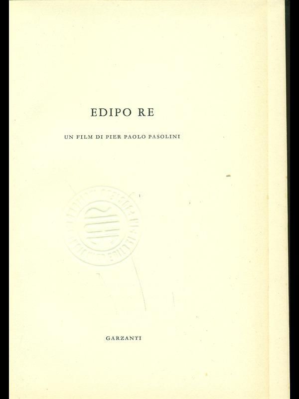 Prima edizione della sceneggiatura di Edipo re (1967) di Pier Paolo Pasolini edita da Garzanti nella collana «Film e Discussioni» a cura di Giacomo Gambetti. Insieme alla sceneggiatura, il volume comprende scritti di Pasolini e di Gambetti sul film e sulla sua lavorazione. Finito di stampare il 28 agosto 1967. Con all’interno 50 fotografie di scena in bianco e nero del film.