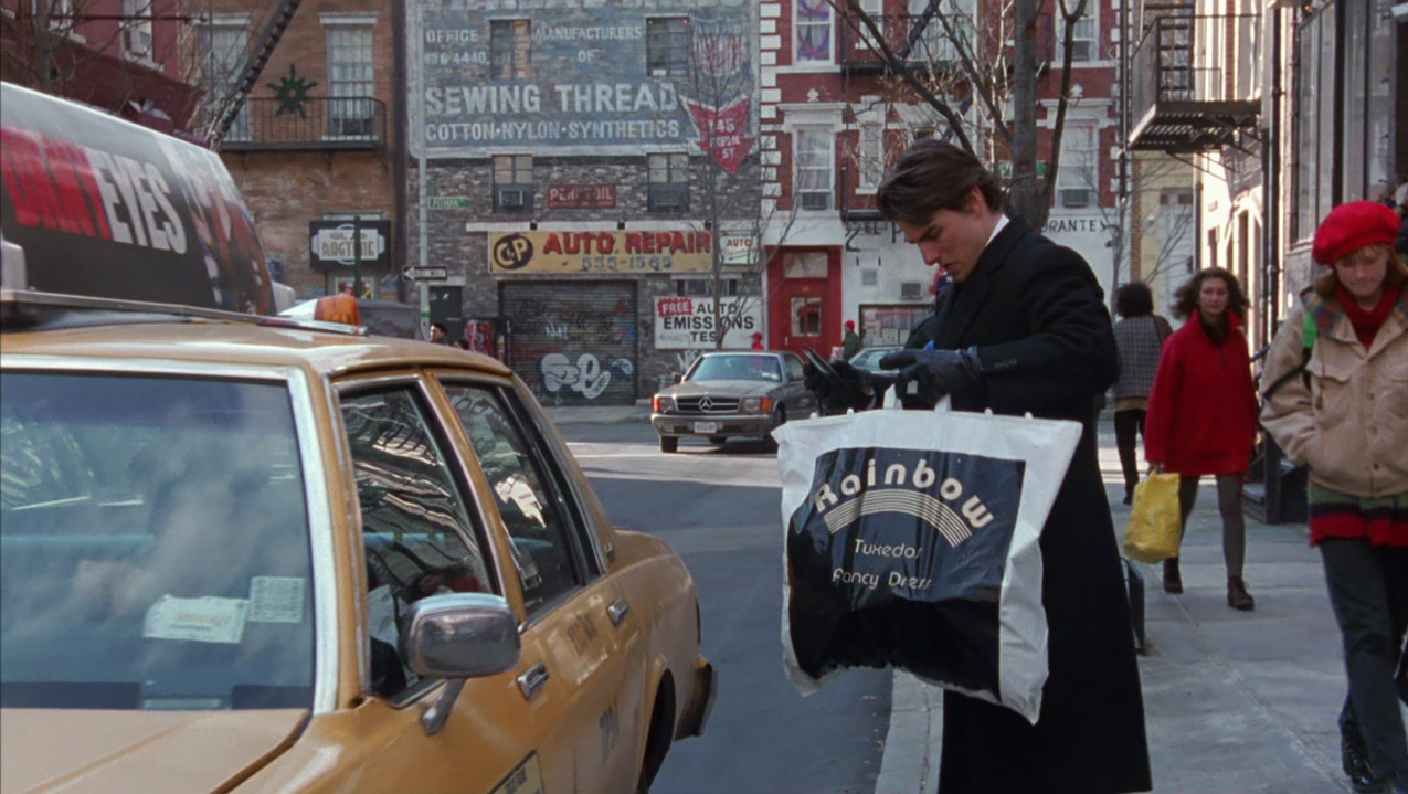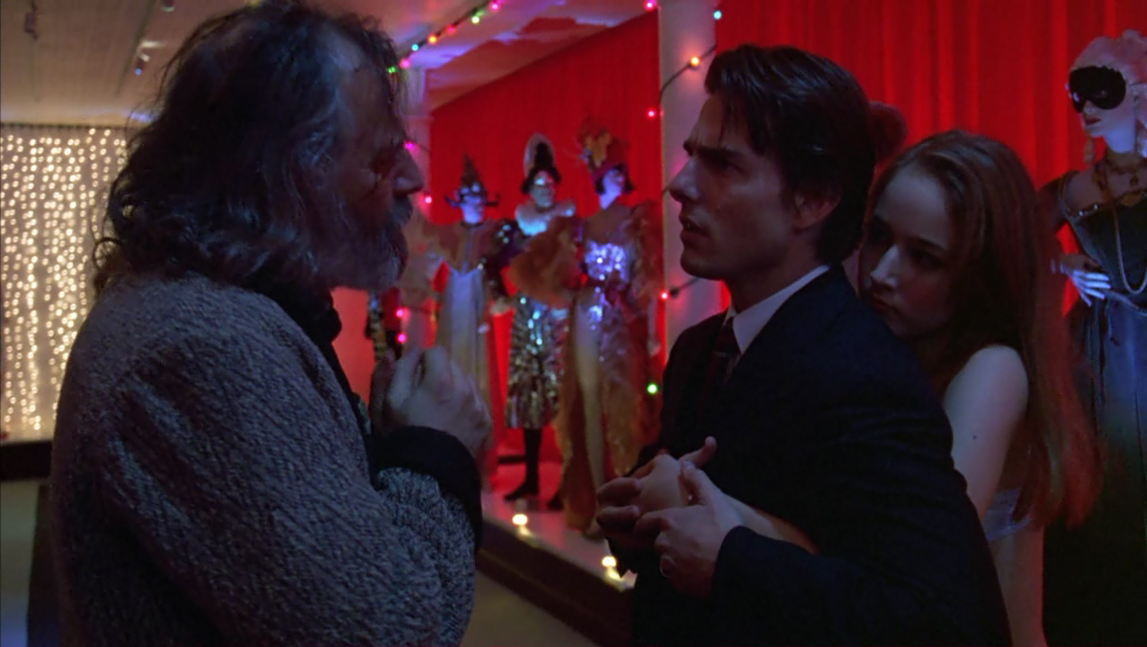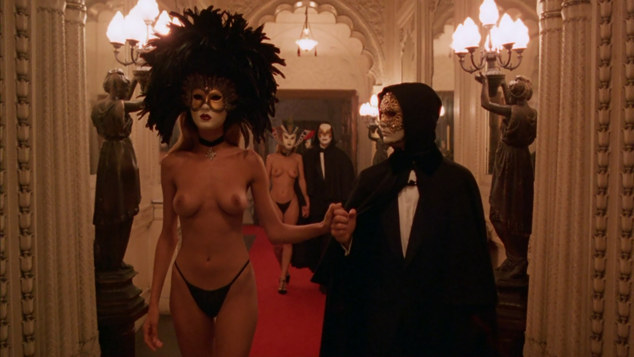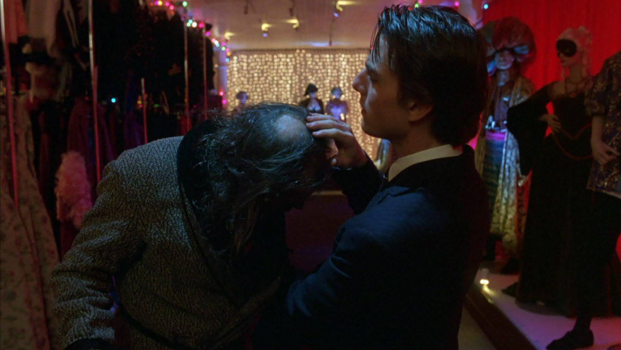 Oramai scosso dagli avvenimenti, Bill anziché rincasare vaga per la New York notturna, fino a farsi adescare da una giovane prostituta con la quale però non consuma alcun rapporto, cercando di rassicurare per telefono Alice che non lo vede rincasare. Di nuovo in strada, Bill si reca nel locale dove si esibisce Nick Nightingale, un pianista amico ai tempi dell’università e nuovamente incontrato al party di Ziegler. Questi gli parla di un prossimo lavoro in un luogo segreto dove deve suonare a occhi bendati, e dove per entrare occorrono una maschera e una parola d’ordine: si tratta di un convito orgiastico strettamente esclusivo. Bill più che mai curioso, nonostante le preghiere di Nick a desistere, gli chiede alcuni dettagli come la parola d’ordine utile all’ingresso, Fidelio, e l’indirizzo. Così, di propria iniziativa, si reca presso un noleggiatore di costumi slavo, mr.Milich, imbattendosi in un’ennesima situazione scabrosa. Il negoziante ha infatti colto sul fatto la figlia adolescente nascosta dietro un divano a intrattenersi con due uomini, e la redarguisce aspramente scacciando quelli che paiono due intrusi.
