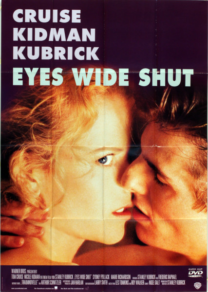 Manifesto tedesco di Eyes Wide Shut (1999) di Stanley Kubrick. L’immagine fotografica del primo piano della coppia di divi Nicole Kidman & Tom Cruise intenta a baciarsi appare scontornata e priva della cornice barocca presente nella versione del manifesto americano. Tale immagine è stata scelta dai responsabili del marketing della Warner Bros in alternativa ad altri artwork maggiormente stilizzati, tra cui uno proposto da Katharina Kubrick Hobbs e Christiane Kubrick. Per la prima volta, in un film targato Warner, il nome di Stanley Kubrick (deceduto prima dell’uscita del film) appare incolonnato insieme a quello degli interpreti Cruise e Kidman sopra il titolo e in ordine alfabetico.