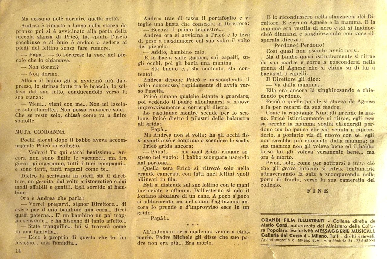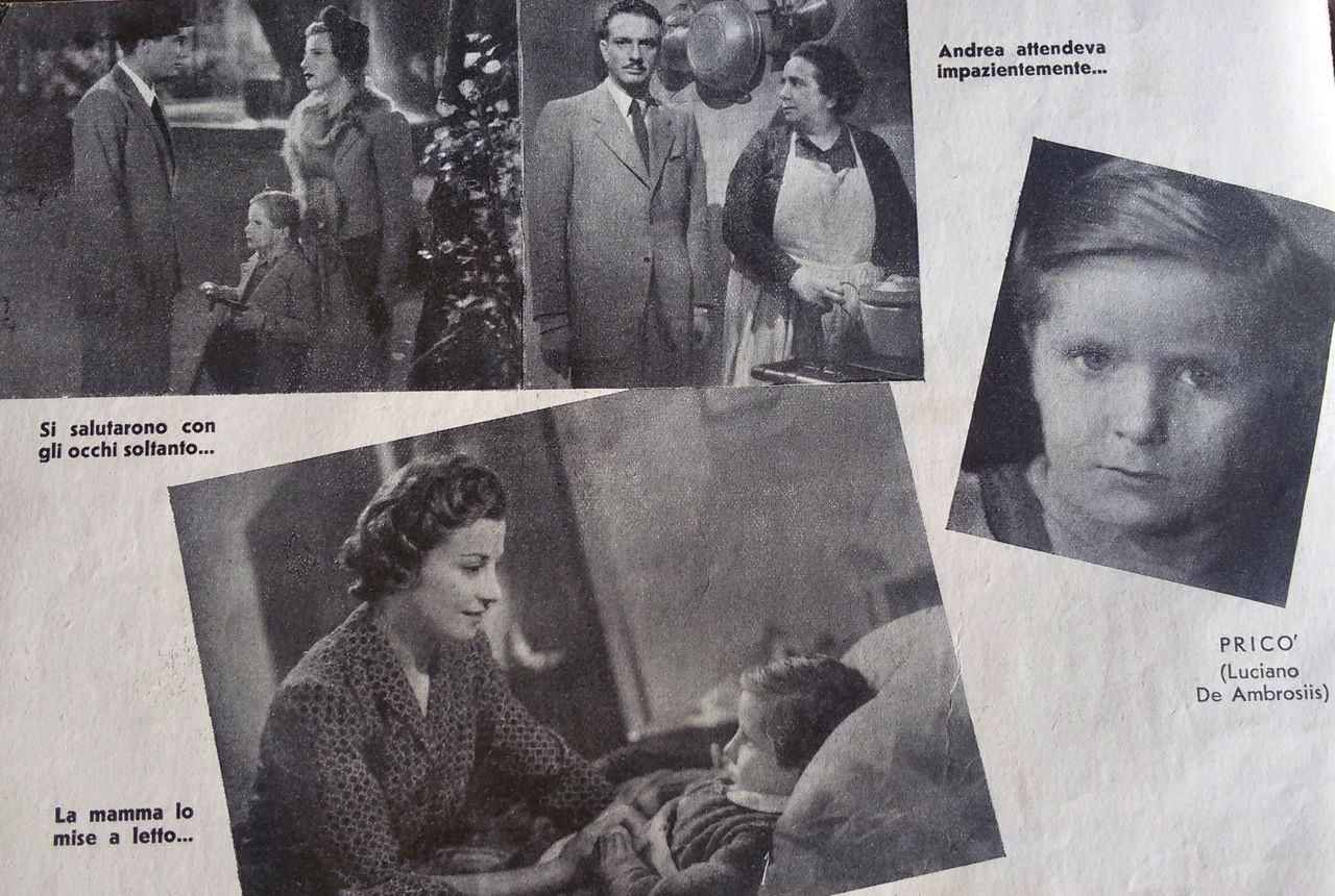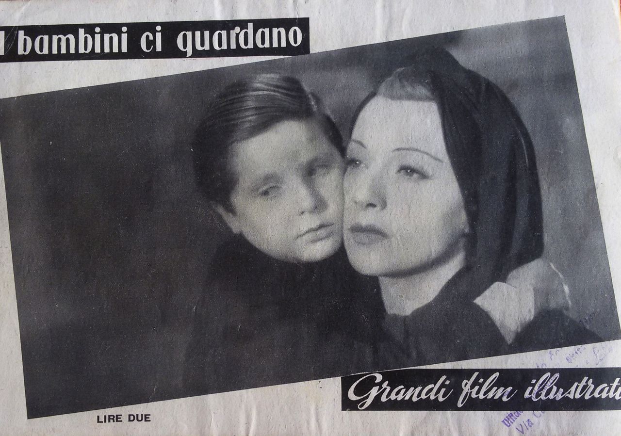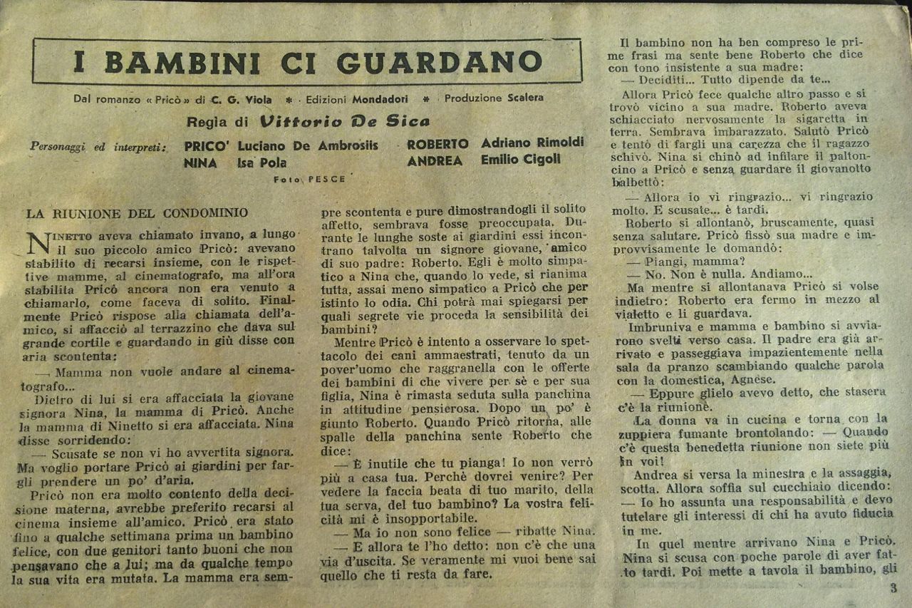 Film di riferimento:  I bambini ci guardano (Italia, 1943) di Vittorio De Sica. Sceneggiatura di Cesare Zavattini, Cesare Giulio Viola, Margherita Maglione, Adolfo Franci, Gherardo Gherardi, Vittorio De Sica. Tratto dal romanzo "Pricò" di Cesare Giulio Viola. Fotografia di Giuseppe Caracciolo, Otello Martelli. Musica di Renzo Rossellini. Con Luciano De Ambrosis, Emilio Cigoli, Isa Pola, Adriano Rimoldi, Giovanna Cigoli, Tecla Scarano, Ione Frigerio, Olinto Cristina, Maria Gardena, Dina Perbellini, Nicoletta Parodi, Claudia Marti, Ernesto Calindri, Mario Gallina, Zaira La Fratta, Armando Migliari, Guido Morisi, Achille Majeroni, Augusto Di Giovanni, Agnese Dubbini, il prestigiatore Gabrielli, Lina Marengo, Riccardo Fellini, Gino Viotti, Giovanna Ralli
