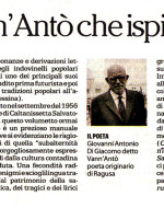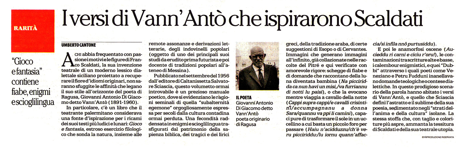 A chi abbia frequentato con passione i motivi e le figure di Franco Scaldati, la sua invenzione teatrale di un moderno lessico dialettale siciliano proiettato a recuperare il fiore d’idiomi originari, non saranno sfuggite le affinità che legano il suo stile all’orizzonte del poeta di Ragusa, Giovanni Antonio Di Giacomo detto Vann’Antò (1891-1960).