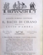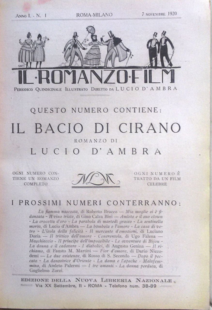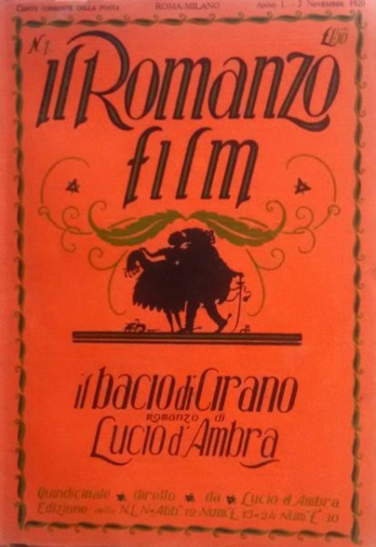 Numero 1 della prima rivista italiana di cineromanzi, «Il Romanzo Film», periodico quindicinale illustrato, diretto dallo scrittore e regista romano Lucio D’Ambra (pseudonimo di Renato Eduardo Manganella), che presenta «romanzi completi tratti da film celebri». Ed è proprio di Lucio D’Ambra il romanzo di questo primo numero, datato 7 novembre 1920Il bacio di Cirano, tratto dal proprio soggetto per l’omonimo film del 1919, prodotto dalla sua «D’Ambra Film» e diretto da Carmine Gallone.