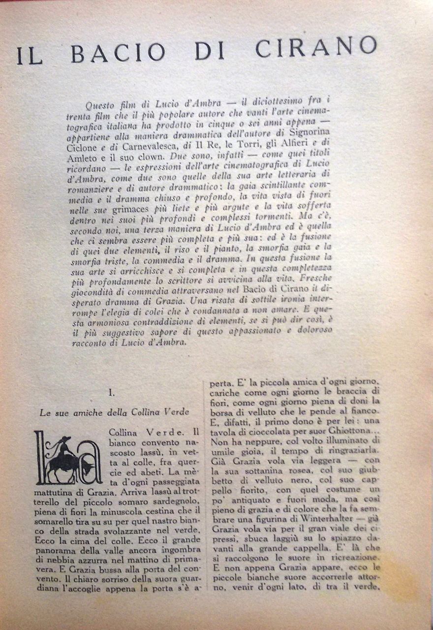 Ecco, ad esempio, come viene introdotto il romanzo Il bacio di Cirano di d’Ambra nel primo numero della rivista: “Due sono le espressioni dell’arte cinematografica di Lucio d’Ambra, come due sono quella della sua arte letteraria di romanziere e di autore drammatico: la gaia scintillante commedia e il dramma chiuso e profondo, la vita vista di fuori nelle sue grimaces più liete e più argute e la vita sofferta dentro nei suoi più profondi e complessi tormenti. Ma c’è, secondo noi, una terza maniera di Lucio d’Ambra ed è quella che ci sembra essere  più completa e più sua: ed è la fusione di quei due elementi, il riso e il pianto, la smorfia gaia e la smorfia triste, la commedia e il dramma”.