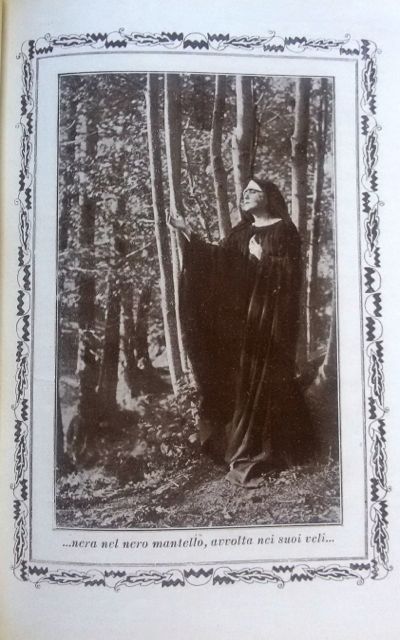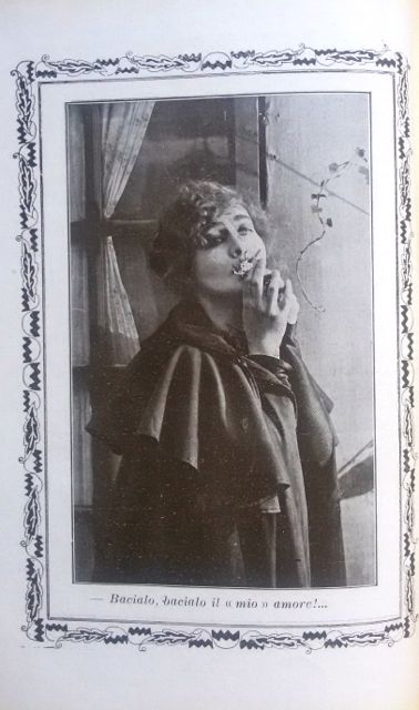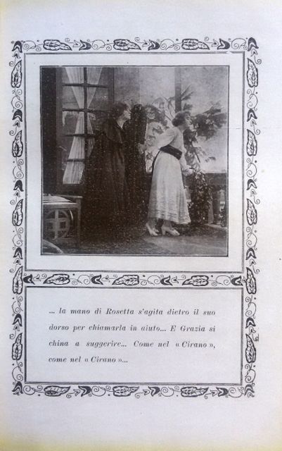 (…) Per farci un’idea dello stretto connubio tra desiderio d’arte e svolazzi di facile consumo, portiamo un esempio tratto dal Bacio di Cirano di d’Ambra, dove una fanciulla bella e caritatevole, ma minata da un male impietoso, si innamora di Claudio, un compositore ritiratosi in campagna per trovare ispirazione. Poi, tra mille palpiti, la ragazza decide di aiutare la sua più cara amica a conquistare il cuore del musicista, suggerendole le parole d’amore che le sgorgano sincere dal petto. Ecco questo passo descrittivo intriso di lirismo: