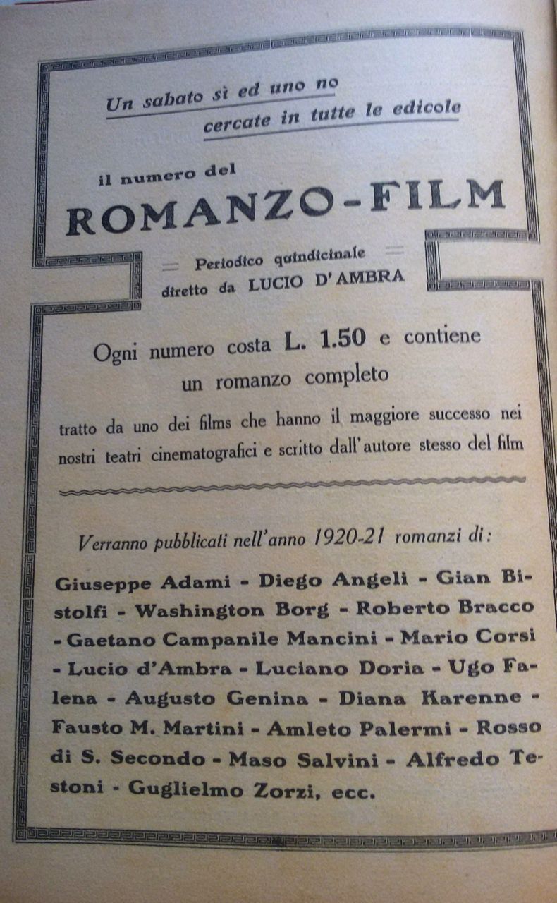 (…) Molte delle firme impegnate nel Romanzo film potevano contare su una professionalità letteraria già ampiamente sperimentata. È soprattutto il caso del direttore della rivista, Lucio d’Ambra, il cui nome campeggia in bella vista su tutte le copertine del Romanzo film, con evidenti scopi promozionali, visto che d’Ambra era allora una figura di primo piano nella vita culturale del Paese, oltre che uno degli scrittori più letti.