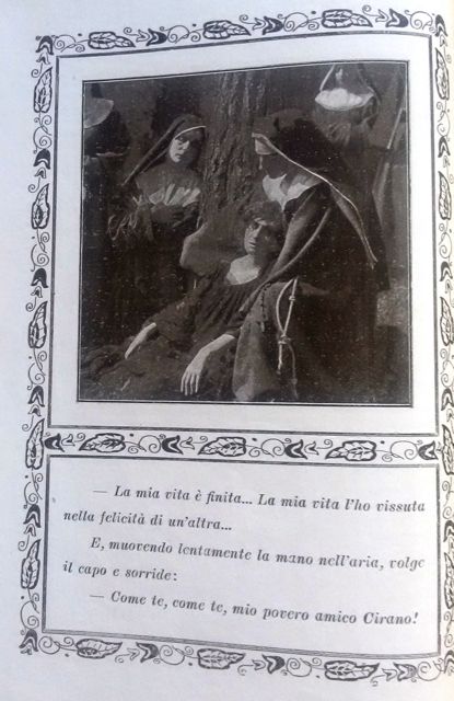 « Meglio non poteva essere reso, sì come tema che come svolgimento. Mentre nella commedia di Rostand, Cirano fa da innamorato infelice, in questo lavoro è la protagonista che, affetta da malattia incurabile, deve far tacere i palpiti del suo cuore, per la prima volta amante e che vorrebbe cantare, in faccia al mondo, l’amore immenso del quale è colmo. Lavoro tutto al femminile, tratteggiato da trovate magnifiche, tutto un avvicendarsi di fatti, direi quasi, reali, positivi, sorprendenti per sentimento e candore, non l’amore carnale che, sazio, s’annoia, ma l’amore sano che nasce e conduce alla morte quella pianticella dal quale ne è scossa. Soava Gallone, l’attrice dai cento volti, ebbe campo in questo lavoro, col suo mobilissimo viso, di manifestare al foltissimo pubblico intervenuto, i sentimenti che la sua anima provava per quell’amore che la natura, supremo schermo per quel corpo mirabile di grazia e di forme, proibiva per una colpa non sua. (…) »