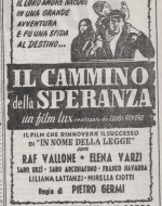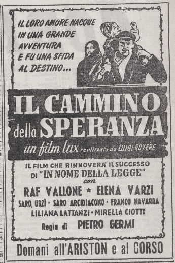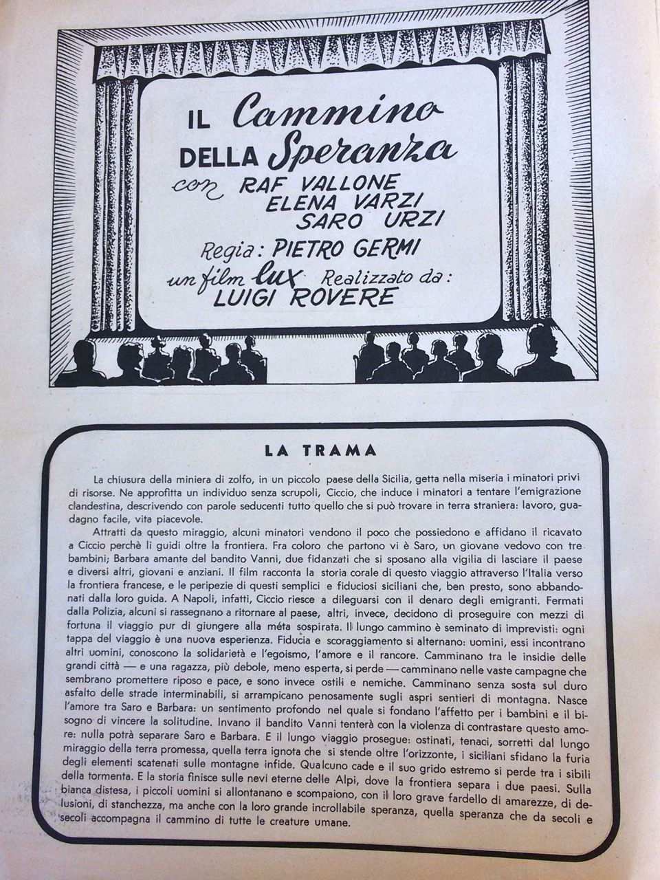 Film di riferimento:  Il cammino della speranza (Italia, 1950) di Pietro Germi. Soggetto di Federico Fellini, Pietro Germi, Tullio Pinelli, ispirato al romanzo "Cuori negli abissi" di Nino Di Maria. Sceneggiatura di Federico Fellini e Tullio Pinelli. Fotografia di Leonida Barboni. Musica di Carlo Rustichelli. Con Raf Vallone, Elena Varzi, Saro Urzì, Franco Navarra, Saro Arcidiacono, Mirella Ciotti