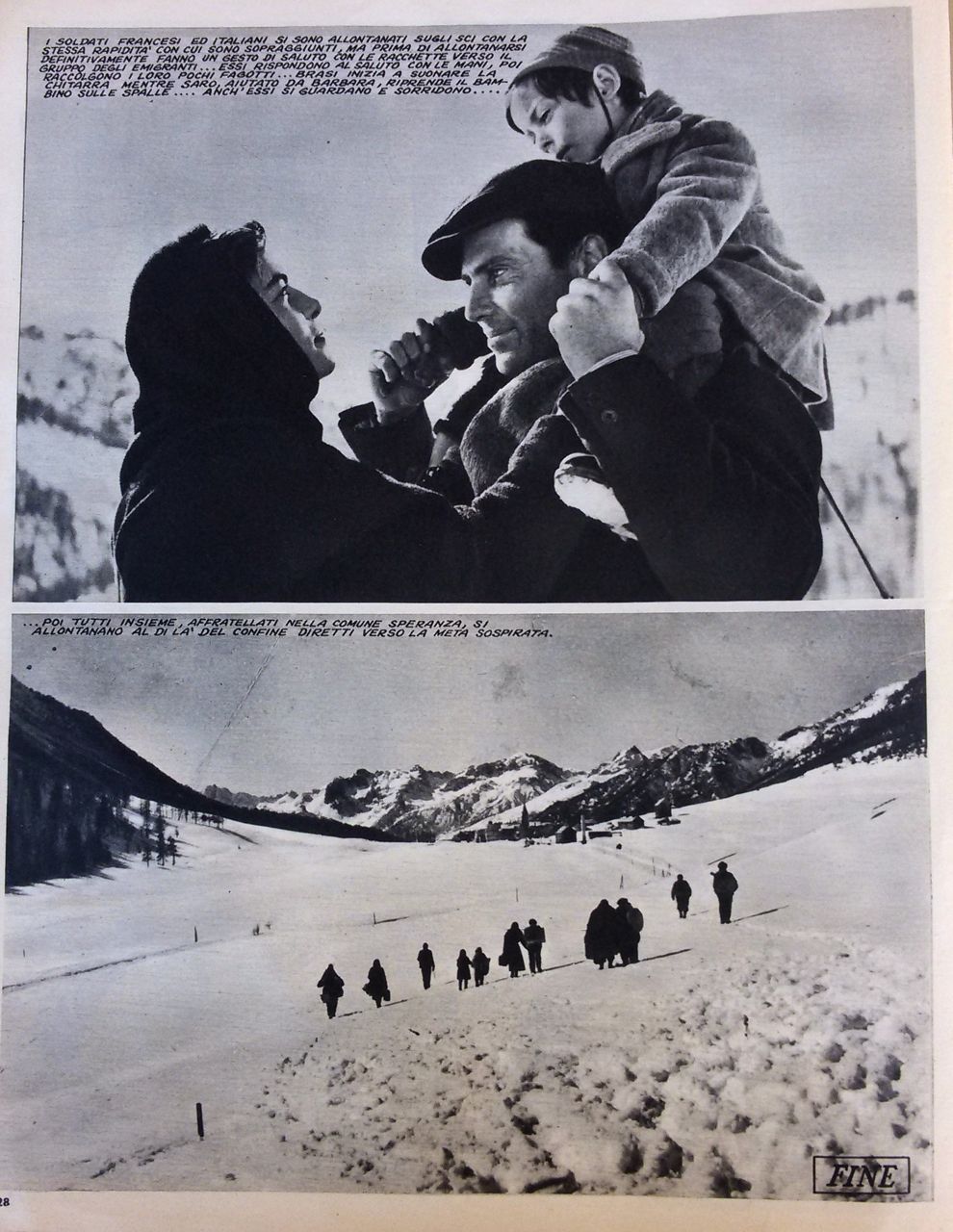 Ai clandestini non resta che proseguire. Nel corso della traversata, il gruppo viene investito da una bufera di cui rimane vittima l’anziano ragioniere che muore assiderato. Gli altri riescono a salvarsi e ad arrivare al confine francese. Quando sembrano a un passo dalla meta, vengono intercettati da due pattuglie di doganieri con gli sci, una francese e l’altra italiana, ai quali appare subito evidente che si tratta di clandestini. Gli agenti, commossi dalle condizioni di povertà e sofferenza degli emigranti, si inteneriscono al sorriso di uno dei bambini e li lasciano valicare la frontiera.