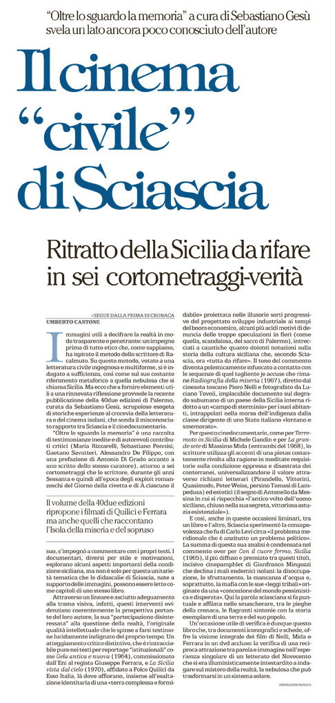 Alla luce della verità, sosteneva Leonardo Sciascia, la scrittura rischia continuamente di eclissarsi anche quando si fa risplendente testimonianza di realtà. Ed è per evitare tale rischio che, in letteratura, ogni nebulosa deve saper generare un “sistema solare” di parole e d’immagini utili a decifrare la realtà in modo trasparente e penetrante: un impegno prima di tutto etico che, come sappiamo, ha ispirato il metodo dello scrittore di Racalmuto. Su questo metodo, votato a una letteratura civile ingegnosa e multiforme, si è indagato a sufficienza, così come sul suo costante riferimento metaforico a quella nebulosa che si chiama Sicilia. Ma ecco che a fornire elementi utili a una rinnovata riflessione provvede la recente pubblicazione della 40due edizioni di Palermo, curata da Sebastiano Gesù, scrupoloso esegeta di storiche esperienze al crocevia della letteratura e del cinema isolani, che sonda il misconosciuto rapporto tra Sciascia e il cinedocumentario. Oltre lo sguardo la memoria è una raccolta di testimonianze inedite e di autorevoli contributi critici (Maria Rizzarelli, Sebastiano Pennisi, Gaetano Savatteri, Alessandro De Filippo, con una prefazione di Antonio Di Grado accanto a uno scritto dello stesso curatore), attorno a sei cortometraggi che lo scrittore, durante gli anni Sessanta e quindi all’epoca degli exploit romanzeschi del Giorno della civetta e di A ciascuno il suo, s’impegnò a commentare con i propri testi. I documentari, diversi per stile e motivazioni, esplorano alcuni aspetti importanti della condizione siciliana, ma non è solo per questa unitarietà tematica che le didascalie di Sciascia, nate a supporto delle immagini, possono essere lette come capitoli di uno stesso libro. Attraverso un lineare e asciutto adeguamento alla trama visiva, infatti, questi interventi evidenziano coerentemente la prospettiva portante del loro autore, la sua “partecipazione disinteressata” alla questione della realtà, l’originale qualità intellettuale che lo spinse a farsi testimone lucidamente indignato del proprio tempo. Un atteggiamento critico distintivo, che è rintracciabile pure nei testi per reportage “istituzionali” come Gela antica e nuova (1964), commissionato dall’E.N.I. al regista Giuseppe Ferrara, e La Sicilia vista dal cielo (1970), affidato a Folco Quilici da Esso Italia, là dove affiorano, insieme all’esaltazione identitaria di una “terra complessa e formidabile” proiettata nelle illusorie sorti progressive del progettato sviluppo industriale ai tempi del boom economico, alcuni più acidi motivi di denuncia delle troppe speculazioni in fieri (come quella, scandalosa, del sacco di Palermo), intrecciati a caustiche quanto dolenti notazioni sulla storia della cultura siciliana che, secondo Sciascia, era “tutta da rifare”. Il tono del commento diventa polemicamente infuocato a contatto con le sequenze di quel tagliente je accuse che rimane Radiografia della miseria (1967), diretto dal cineasta toscano Piero Nelli e fotografato da Luciano Tovoli, implacabile documento sul degrado subumano di un paese della Sicilia interna ridotto a un “campo di sterminio” per i suoi abitanti, intrappolati nella morsa dell’indigenza dalla classe dirigente di uno Stato italiano “lontano e smemorato”.