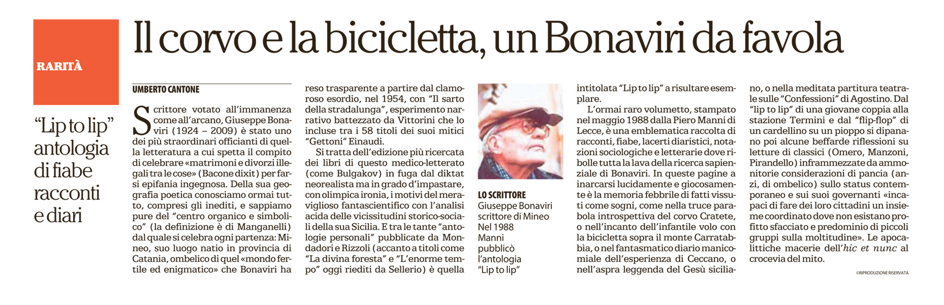 Scrittore votato all’immanenza come all’arcano, Giuseppe Bonaviri (1924 – 2009) è stato uno dei più straordinari officianti di quella letteratura a cui spetta il compito di celebrare “matrimoni e divorzi illegali tra le cose” (Bacone dixit) per farsi epifania ingegnosa. Della sua geografia poetica conosciamo ormai tutto, compresi gli inediti, e sappiamo pure del “centro organico e simbolico” (la definizione è di Manganelli) dal quale si celebra ogni partenza: Mineo, suo luogo natio in provincia di Catania, ombelico di quel “mondo fertile ed enigmatico” che Bonaviri ha reso trasparente a partire dal clamoroso esordio, nel 1954, con “Il sarto della stradalunga”, esperimento narrativo battezzato da Vittorini che lo incluse tra i 58 titoli dei suoi mitici “Gettoni” Einaudi. Si tratta dell’edizione più ricercata dei libri di questo medico-letterato (come Bulgakov) in fuga dal diktat neorealista ma in grado d’impastare, con olimpica ironia, i motivi del meraviglioso fantascientifico con l’analisi acida delle vicissitudini storico-sociali della sua Sicilia. E tra le tante “antologie personali” pubblicate da Mondadori e Rizzoli (accanto a titoli come “La divina foresta” e “L’enorme tempo” oggi riediti da Sellerio) è quella intitolata “Lip to lip” a risultare esemplare. L’ormai raro volumetto, stampato nel maggio 1988 dalla Piero Manni di Lecce, è una emblematica raccolta di racconti, fiabe, lacerti diaristici, notazioni sociologiche e letterarie dove ribolle tutta la lava della ricerca sapienziale di Bonaviri. In queste pagine a inarcarsi lucidamente e giocosamente è la memoria febbrile di fatti vissuti come sogni, come nella truce parabola introspettiva del corvo Cratete, o nell’incanto dell’infantile volo con la bicicletta sopra il monte Carratabbìa, o nel fantasmatico diario manicomiale dell’esperienza di Ceccano, o nell’aspra leggenda del Gesù siciliano, o nella meditata partitura teatrale sulle “Confessioni” di Agostino. Dal “lip to lip” di una giovane coppia alla stazione Termini e dal “flip-flop” di un cardellino su un pioppo si dipanano poi alcune beffarde riflessioni su letture di classici (Omero, Manzoni, Pirandello) inframmezzate da ammonitorie considerazioni di pancia (anzi, di ombelico) sullo status contemporaneo e sui suoi governanti “incapaci di fare dei loro cittadini un insieme coordinato dove non esistano profitto sfacciato e predominio di piccoli gruppi sulla moltitudine”. Le apocalittiche macerie dell’hic et nunc al crocevia del mito.