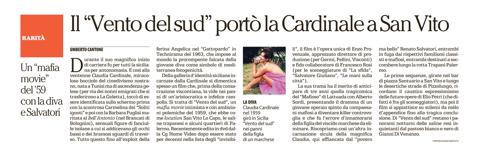 Durante il suo magnifico inizio di carriera fu per tutti la siciliana per antonomasia. E così alla ventenne Claudia Cardinale, miracoloso bocciolo del cinedivismo nostrano, nata a Tunisi ma di ascendenza gelese (per via dei nonni emigrati che si trasferirono a La Goletta), toccò di essere identificata sullo schermo prima con la scontrosa Carmelina dei “Soliti ignoti” e poi con la Barbara Puglisi maritata al Bell’Antonio (nel Brancati di Bolognini), sensuali figure di fanciulle isolane a cui si addicevano gli occhi bassi o dei bramosi sguardi di traverso. Tutto questo fino all’exploit della ferina Angelica nel “Gattopardo” in Technirama del 1963, che impose al mondo la prorompente falcata della giovane diva come simbolo di mediterranea fotogenicità. Della galleria d’identità siciliane incarnate dalla Cardinale si dimentica spesso un film che, prima della consacrazione viscontiana, la vide nei panni di un’aristocratica e infelice rampolla. Si tratta di “Vento del sud”, un mafia movie intimista e con ambizioni polemiche del 1959, che ebbe come location San Vito Lo Capo, le saline trapanesi e alcuni quartieri di Palermo. Recentemente edito in dvd dalla CG Home Video dopo essere stato per decenni nella lista degli “invisibili”, il film è l’opera unica di Enzo Provenzale, apprezzato direttore di produzione (per Germi, Fellini, Visconti) e fido collaboratore di Francesco Rosi (per le sceneggiature di “La sfida”, “Salvatore Giuliano”, “Le mani sulla città”). La sua trama ha il merito di anticipare di tre anni quella tragicomica del “Mafioso” di Lattuada con Alberto Sordi, presentando il dramma di un giovane operaio spinto da compaesani mafiosi a diventare killer controvoglia e che fa l’errore d’innamorarsi della figlia del viscido marchese da eliminare. Riscopriamo così un’altra incarnazione sicula della splendida Claudia, qui affiancata dal “povero ma bello” Renato Salvatori, entrambi in fuga dai rispettivi familismi classisti e mafiosi, entrambi destinati a soccombere lungo la rotta Trapani-Palermo. Le prime sequenze, girate nel bar di piazza Santuario a San Vito e lungo le desertiche strade di Pizzolungo, ricordano il caustico espressionismo delle future opere di Elio Petri (che difatti è fra gli sceneggiatori), ma poi il film si appiattisce su stilemi da mélo d’appendice fino alla tragica conclusione solo vagamente “di denuncia”. Oltre all’icona Cardinale, di “Vento del sud” restano i panorami notturni delle saline resi inquietanti dal pastoso bianco e nero del grande direttore di fotografia Gianni Di Venanzo.