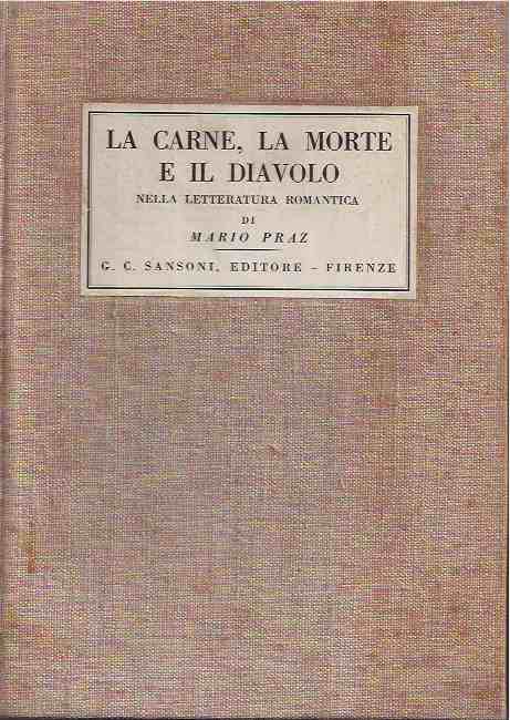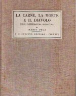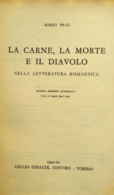 Prima edizione Einaudi di La carne, la morte e il diavolo nella letteratura romantica, raccolta organica di saggi che l’anglista e studioso di estetica Mario Praz fece pubblicare per la prima volta nel 1930 dalla Società Editrice La Cultura in una tiratura di 1000 copie su carta vergata.