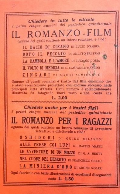 « (…) Il progetto del Romanzo film si distingue nel panorama editoriale per la sua esibita vocazione ad avvicinare la prosa letteraria e il racconto cinematografico. L’abbraccio tra cinema e letteratura è posto in evidenza nella quarta di copertina del primo numero, dove viene illustrato a chiare lettere il principale motivo d’interesse della pubblicazione: “Ogni numero contiene un romanzo completo tratto da uno dei films che hanno il maggiore successo nei nostri teatri cinematografici e scritto dall’autore stesso del film”. Per autore del film occorre intendere lo scrittore dello “scenario”, conformemente alla terminologia allora in uso, anche se in vari casi registriamo la coincidenza tra scrittore e direttore artistico del film. Succede per Lucio d’Ambra, Amleto Palermi, Mario Almirante, Enrico Roma, Augusto Camerini, Luciano Doria, Ugo Falena.