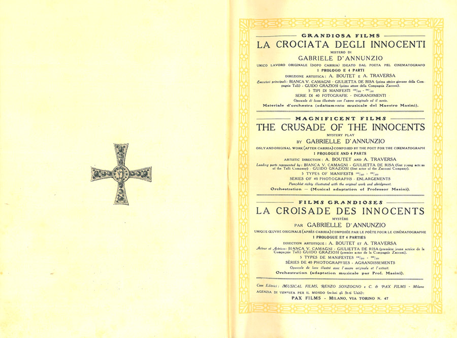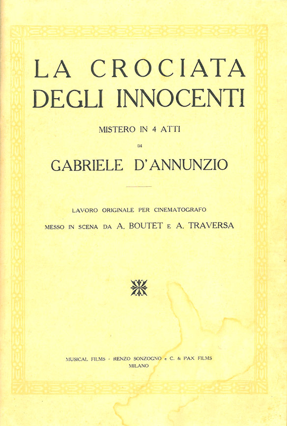 Film di riferimento:  La crociata degli innocenti (Italia, 1917) di A.Boutet e AlbertoTraversa. Sceneggiatura di Gabriele D'Annunzio tratta dal suo dramma omonimo. Fotografia di Arturo Gallea, Giovanni Vitrotti, Stesilio Moresanti. Con Bianca Virginia Camagni, Giulietta De Riso, Luigi Serventi, Guido Graziosi, Lia Righelli