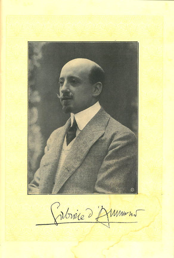 Milano, Musical Films – Renzo Sonzogno e C. & Pax Films (Stab. Grafico Industriale Gustavo Modiano & C.), 1915, in 8°, Punto metallico con copertina in brossura semirigida con unghie, stampa tattile tono su tono al piatto anteriore, nastro ornamentale in seta oro al dorso, pp. 36 nn., carta patinata con testo in cornice gialla; ill. fotografiche n.t. ❦ Rarissima brochure originale di accom- pagnamento alla versione filmica del dramma dannunziano. Ele- gantissima veste tipografica garantita dall’officina Modiano. Il testo dell’opera è impaginato a fronte del sunto italiano/francese e di im- magini dal film. Ritratto di D’Annunzio e 13 fotografie delle scene.