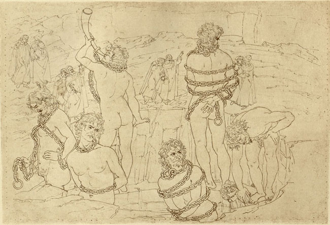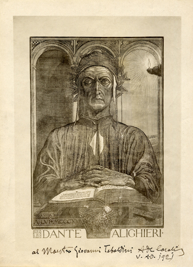 Luigi Ademollo, Achille Alberti, Karl Andreae, Baccio Baldini, Franz von Bayros, Benedetto Da Maiano, Mosé Bianchi, Romeo Bonomelli, Sandro Botticelli, Jean-Baptiste Carpeaux, Andrea Del Castagno, Jean Dargent, Pierino Da Vinci, Adolfo De Carolis, Eugène Delacroix, Gaspare Diziani, Domenico Di Michelino, Gustave Doré, Federico Faruffini, Giovanni Fattori, Giovanni (John) Flaxman, Francesco Fontebasso, Giovan Battista Galizzi, Giuseppe Lorenzo Gatteri, Giotto, Guglielmo Giraldi, Otto Greiner, Vittorio Guaccimanni, Gustavo (Gustav) Jaeger, Joseph Anton Koch, Liberale da Verona, (Scuola del) Mantegna, Luigi Markò, Michelangelo, Karl Mueller, Nando di Cione, Francesco Nenci, Domenico Peterlin, Alfredo Pina, Mirko Racki, Raffaello, F.M. Roganeau, Gabriele Dante Rossetti, Francesco Scaramuzza, Ari Scheffer, M.A. Schiavonio, Luca Signorelli, Harald Slott-Moller, Giovanni Stradano, Giorgio Vasari, Cesare Zocchi, Federico Zuccari.