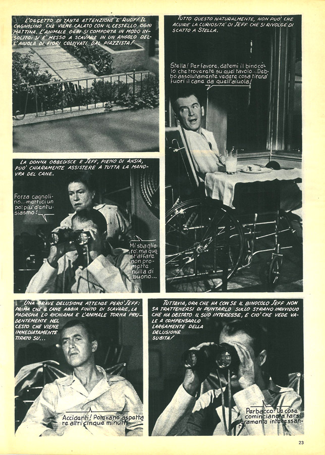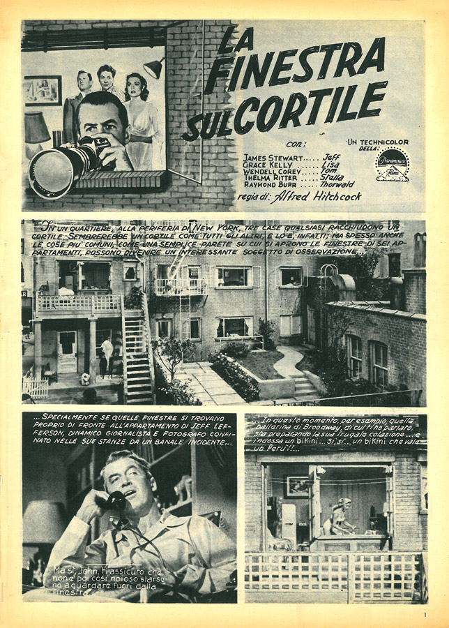 Film di riferimento:  La finestra sul cortile (Rear Window, Stati Uniti 1954) di Alfred Hitchcock. Sceneggiatura di John Michael Hayes, dal racconto "It Had to Be Murder" di William Irish (Cornell Woolrich). Fotografia di Robert Burks. Musica di Franz Waxman. Con James Stewart, Grace Kelly, Wendell Corey, Thelma Ritter, Raymond Burr, Judith Evelyn, Ross Bagdassarian, Georgine Darcy, Jesslyn Fax, Rand Harper