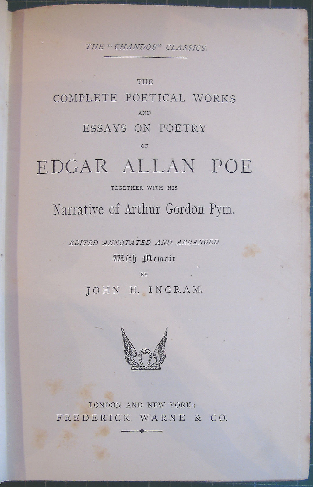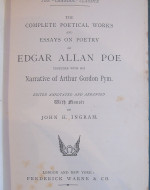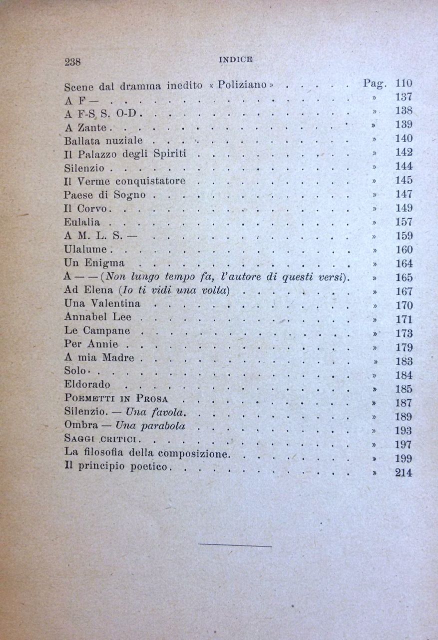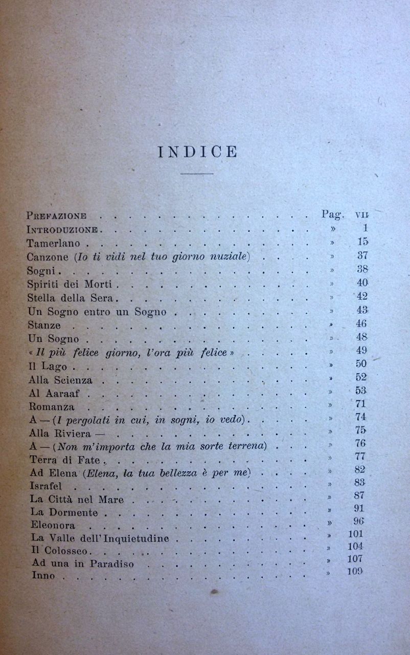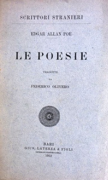 Prima edizione italiana, integrale e critica, delle Poesie di Edgar Allan Poe tradotte dall’anglista e filologo torinese Federico Olivero. Il volume è stato pubblicato nel novembre del 1912 da Giuseppe Laterza Editore di Bari, come numero 5 della collana «Scrittori stranieri».