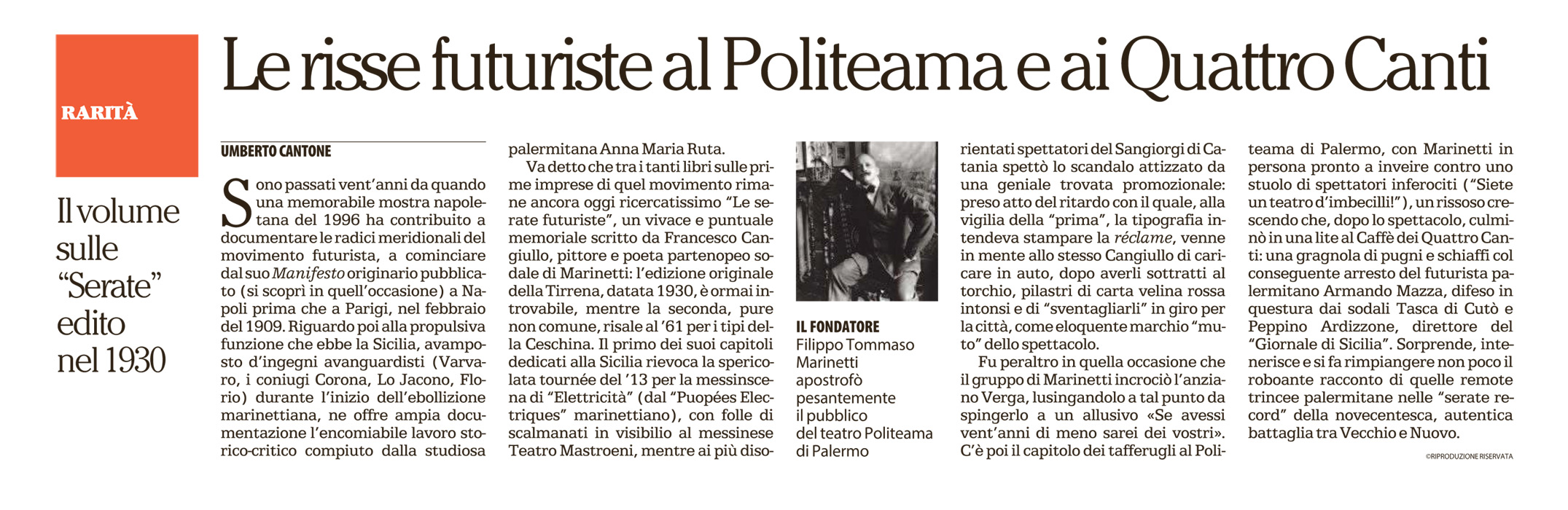 Fu peraltro in quella occasione che il gruppo di Marinetti incrociò l’anziano Verga, lusingandolo a tal punto da spingerlo a un allusivo «Se avessi vent’anni di meno sarei dei vostri». C’è poi il capitolo dei tafferugli al Politeama di Palermo, con Marinetti in persona pronto a inveire contro uno stuolo di spettatori inferociti (“Siete un teatro d’imbecilli!”), un rissoso crescendo che, dopo lo spettacolo, culminò in una lite al Caffè dei Quattro Canti: una gragnola di pugni e schiaffi col conseguente arresto del futurista palermitano Armando Mazza, difeso in questura dai sodali Tasca di Cutò e Peppino Ardizzone, direttore del “Giornale di Sicilia”. Sorprende, intenerisce e si fa rimpiangere non poco il roboante racconto di quelle remote trincee palermitane nelle “serate record” della novecentesca, autentica battaglia tra Vecchio e Nuovo.