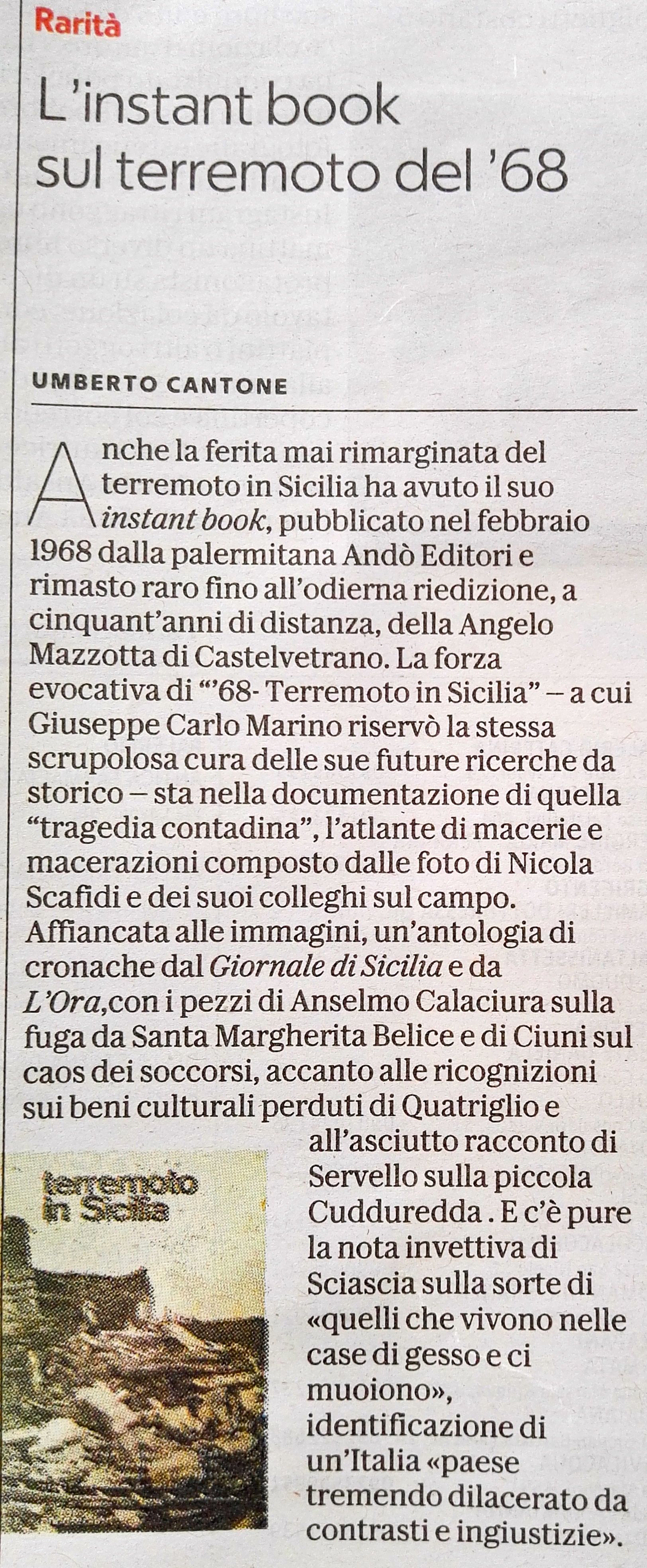 Anche la ferita mai rimarginata del terremoto in Sicilia ha avuto il suo instant book, pubblicato nel 10 febbraio 1968 dalla palermitana Andò Editori e rimasto raro fino all’odierna riedizione, a cinquant’anni di distanza, della Angelo Mazzotta di Castelvetrano.