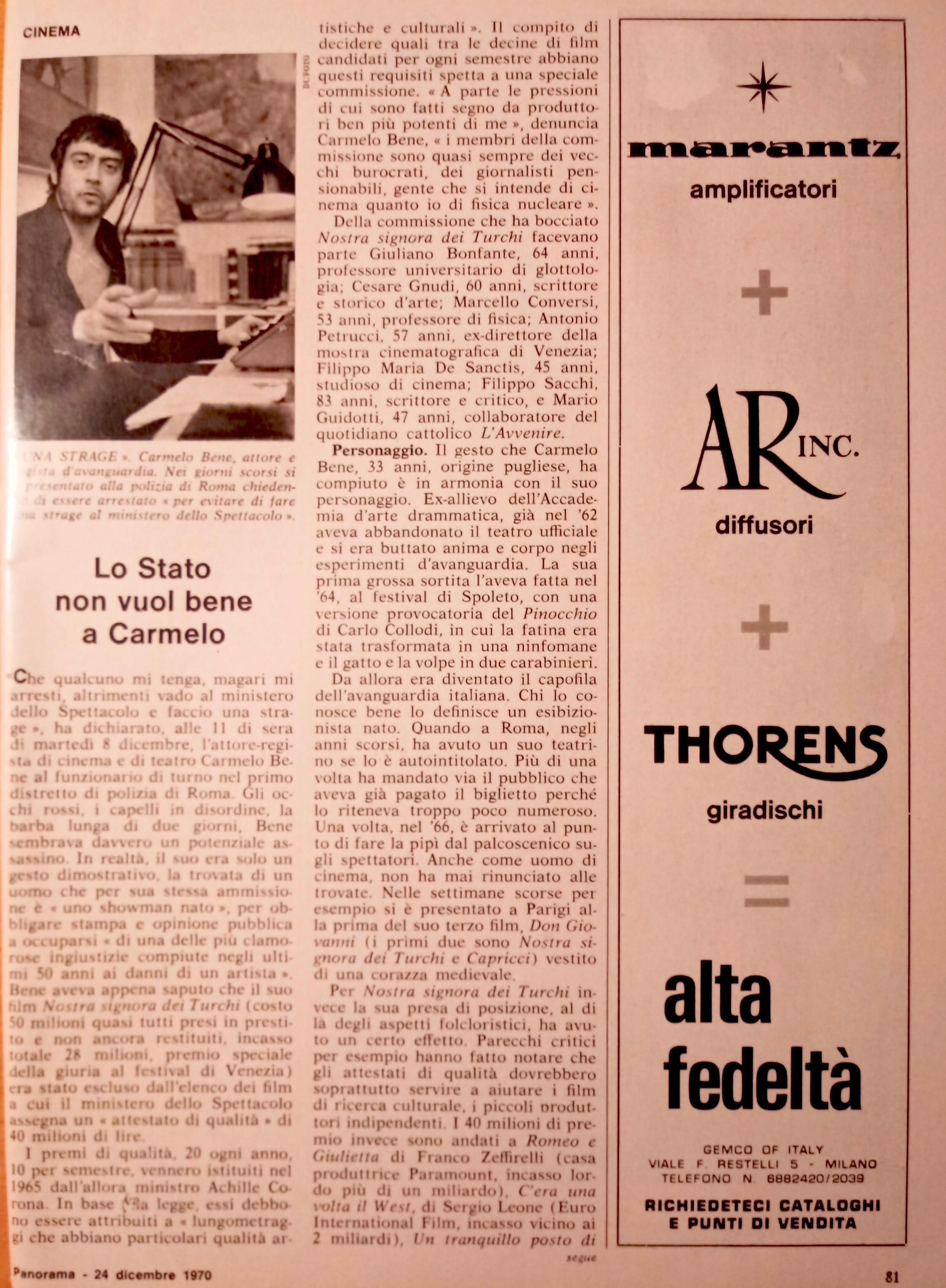 Lo Stato non vuole bene a Carmelo – Carmelo Bene e la polemica col Ministero dello Spettacolo, in “Panorama”, anno IX, n. 245, 24 dicembre 1970