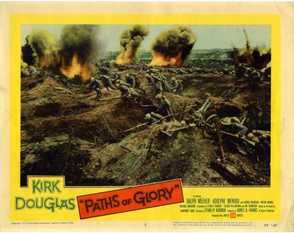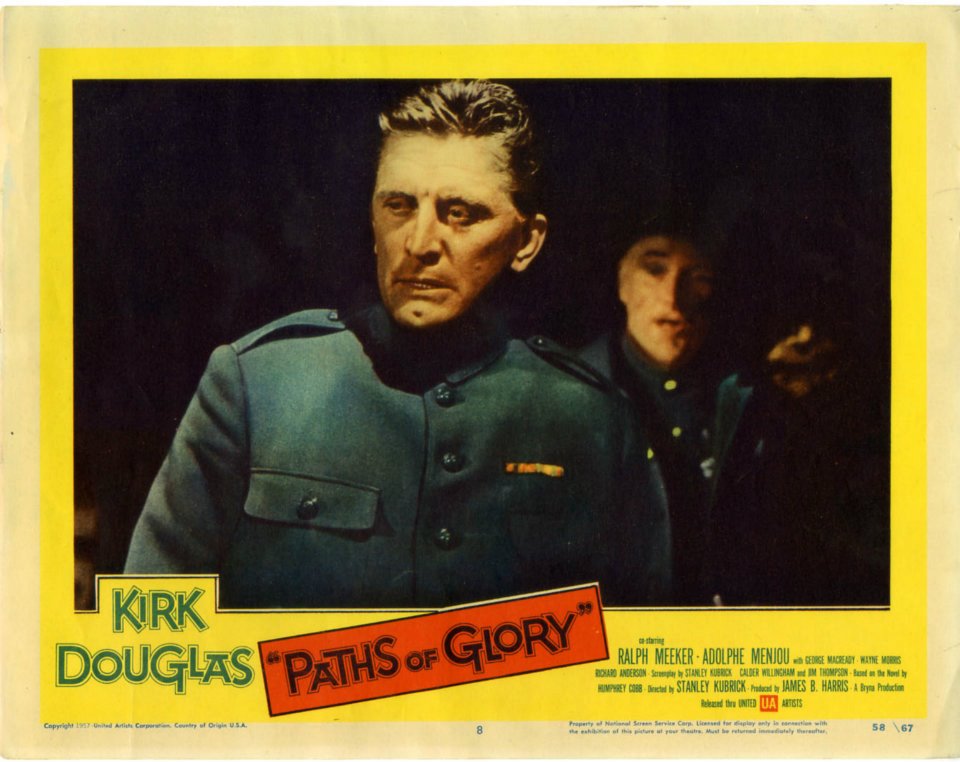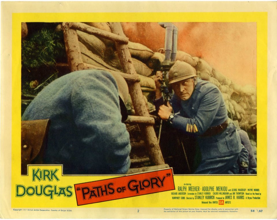 Lobby card della prima edizione americana di Paths of Glory (1957) di Stanley Kubrick, realizzata dai grafici della United Artists. Nonostante il messaggio antimilitarista che il film propone, la campagna pubblicitaria tendeva a presentarlo come un war movie. Nel caso di questa lobby card, la fotografia di scena abilmente colorizzata mostra un drammatico momento della battaglia per la presa del Formicaio da parte dell’esercito francese durante la Grande Guerra. Il nome del divo protagonista Kirk Douglas compare in rilievo a fianco del titolo del film, mentre quello di Kubrick è allineato nei credits in basso a destra.