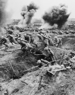 Caratteristiche:  Lobby card con al centro, riquadrata, una fotografia di scena del film che ha per soggetto la battaglia per la presa del Formicaio da parte dell'esercito francese durante la Prima Guerra Mondiale. Fondo giallo, titoli in verde e in rosso