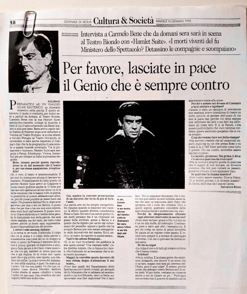 PER FAVORE, LASCIATE IN PACE IL GENIO CHE È SEMPRE CONTRO – Intervista a CARMELO BENE in “Giornale di Sicilia”, martedì 10 gennaio 1995