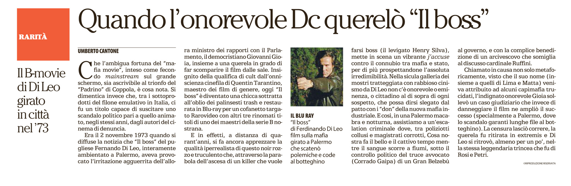 Che l’ambigua fortuna del “mafia movie”, inteso come fecondo mainstream sul grande schermo, sia ascrivibile al trionfo del “Padrino” di Coppola, è cosa nota. Si dimentica invece che, tra i sottoprodotti del filone emulativo in Italia, ci fu un titolo capace di suscitare uno scandalo politico pari a quello animato, negli stessi anni, dagli autori del cinema di denuncia. Era il 2 novembre 1973 quando si diffuse la notizia che “Il boss” del pugliese Fernando Di Leo, interamente ambientato a Palermo, aveva provocato l’irritazione agguerrita dell’allora ministro dei rapporti con il Parlamento, il democristiano Giovanni Gioia, insieme a una querela in grado di far scomparire il film dalle sale. Insignito della qualifica di cult dall’onniscienza cinefila di Quentin Tarantino, maestro dei film di genere, oggi “Il boss” è diventato una chicca sottratta all’oblio dei palinsesti trash e restaurata in Blu-ray per un cofanetto targato Rarovideo con altri tre rinomati titoli di uno dei maestri della serie B nostrana. E in effetti, a distanza di quarant’anni, si fa ancora apprezzare la qualità iperrealista di questo noir rozzo e truculento che, attraverso la parabola dell’ascesa di un killer che vuole farsi boss (il levigato Henry Silva), mette in scena un vibrante j’accuse contro il connubio tra mafia e stato, per di più prospettandone l’assoluta irredimibilità. Nella sicula galleria dei mostri tratteggiata con  rabbioso cinismo da Di Leo non c’è onorevole o eminenza, o cittadino al di sopra di ogni sospetto, che possa dirsi slegato dal patto con i  “don” della nuova mafia industriale. E così, in una Palermo macabra e notturna, assistiamo a un’escalation criminale dove, tra poliziotti collusi e magistrati corrotti, Cosa nostra fa il bello e il cattivo tempo mentre il sangue scorre a fiumi, sotto il controllo politico del truce avvocato (Corrado Gaipa) di un Gran Belzebù al governo, e con la complice benedizione di un arcivescovo che somiglia al discusso cardinale Ruffini. Chiamato in causa non solo metaforicamente, visto che il suo nome (insieme a quelli di Lima e Matta) veniva attribuito ad  alcuni capimafia trucidati, l’indignato onorevole Gioia sollevò un caso giudiziario che invece di danneggiare il film ne ampliò il successo (specialmente a Palermo, dove lo scandalo garantì lunghe file al botteghino e una parte del mezzo miliardo allora incassato). La censura lasciò correre, la querela fu ritirata in extremis e Di Leo si ritrovò, almeno per un po’, nella stessa leggendaria trincea che fu di Rosi e Petri.