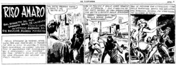 Cineromanzo a fumetti di Mara Baldeva tratto dal film Riso amaro (1949) di Giuseppe De Santis. Si tratta dell’unico cineromanzo a fumetti ricavato dai fotogrammi e dalle fotografie di scena del film, edito dalla casa editrice romana «Lanterna Magica» (direttore Luigi De Laurentiis) come n.2 della popolare rivista mensile Cineromanzo Gigante di cui fu direttore responsabile Adelaide Marzullo. La rivista interruppe le pubblicazioni a fine estate del 1957. Del film di De Santis esiste una versione a fumetti disegnata.