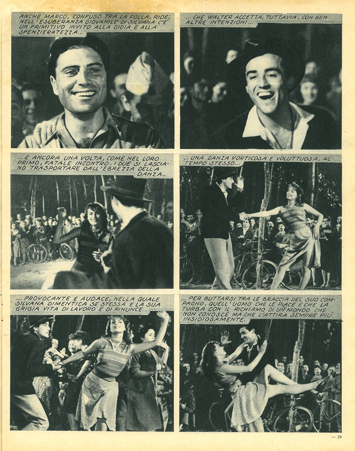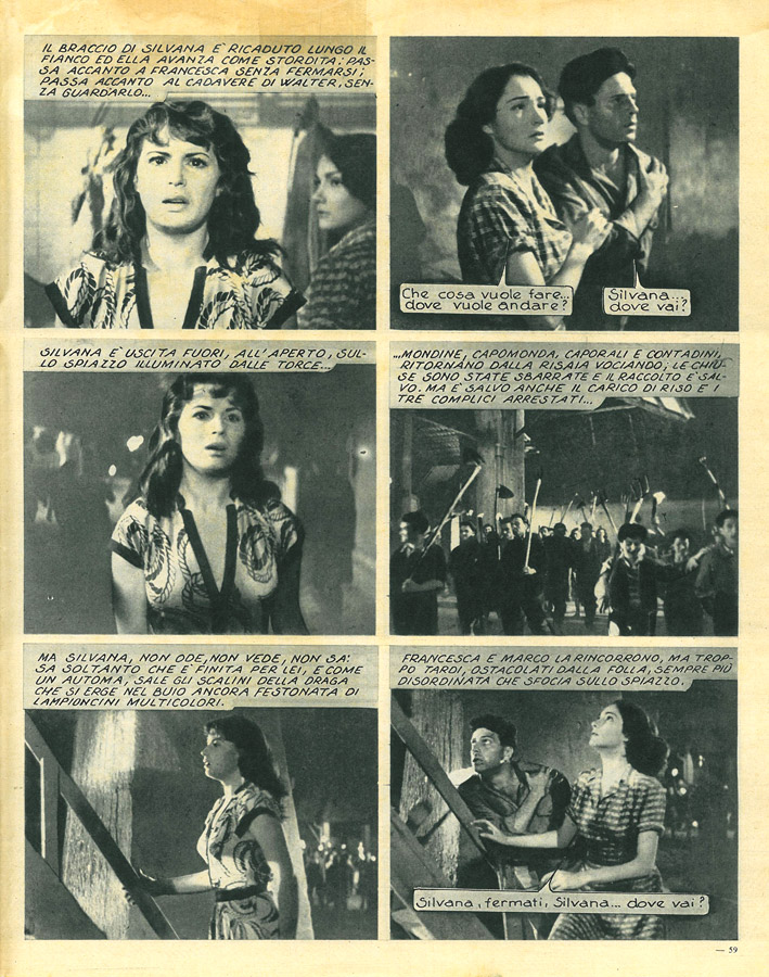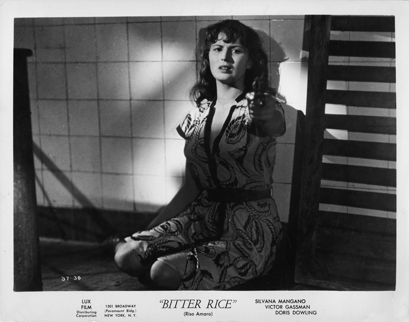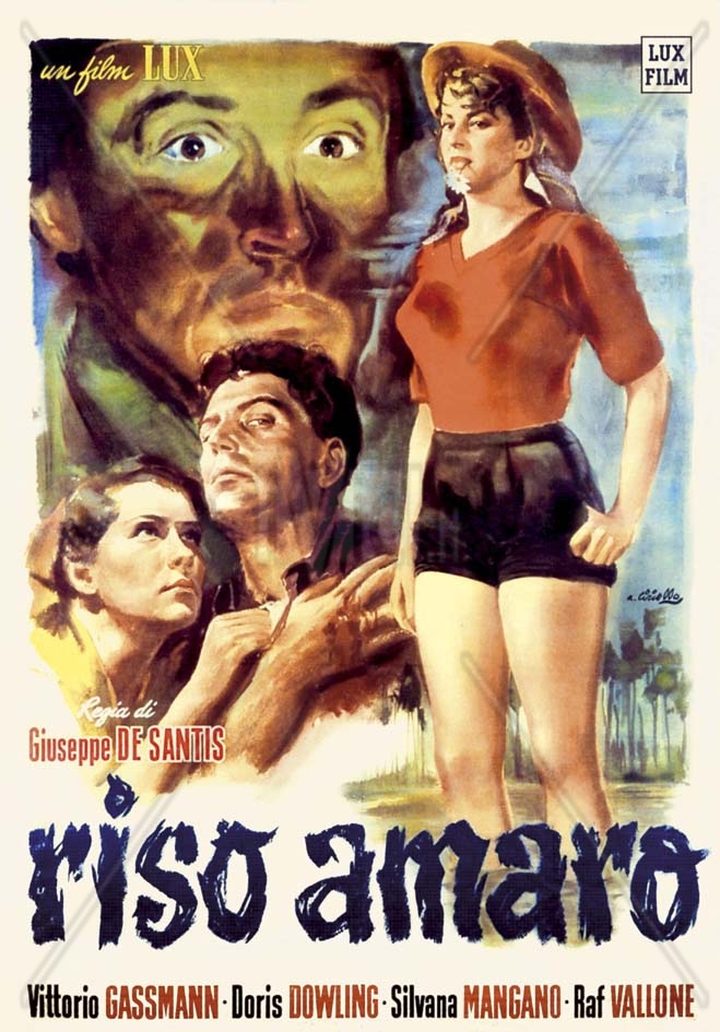 Film di riferimento:  Riso amaro (Italia, 1949) di Giuseppe De Santis. Sceneggiatura di Corrado Alvaro, Giuseppe De Santis, Carlo Lizzani, Gianni Puccini, da un soggetto di Giuseppe De Santis, Carlo Lizzani, Gianni Puccini. Fotografia di Otello Martelli. Musica di Goffredo Petrassi. Con Silvana Mangano, Raf Vallone, Vittorio Gassman, Doris Dowling, Checco Rissone, Nico Pepe, Adriana Silvieri, Anna Maestri, Dedi Ristori, Maria Grazia Francia, Carlo Mazzarella