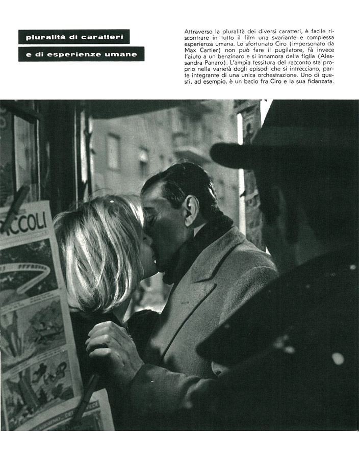 Il pressbook contiene 49 illustrazioni fotografiche in bianco e nero (fotografie di scena e di set, in gran parte realizzate dal fotografo di scena Paul Ronald) assieme alle biografie del regista, degli interpreti (principali e secondari) e dei componenti del cast tecnico del film. Altre note riguardano la lavorazione in esterni a Milano, i trucchi delle riprese, la location del Duomo di Milano e quelle all’idroscalo e poi al lago di Fogliano (in località Capo Portiere, a 70 chilometri da Latina). Accanto alla sinossi, sono pure presenti notazioni sui caratteri dei personaggi e sulla tematica sociale del film. In copertina e sul retro campeggiano altre 2 illustrazioni fotografiche in bianco e nero del film relative alla scena dello stupro.
