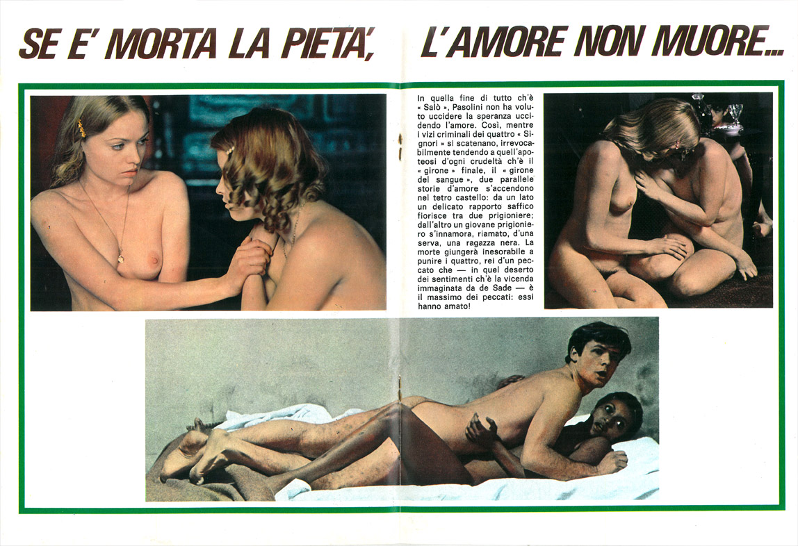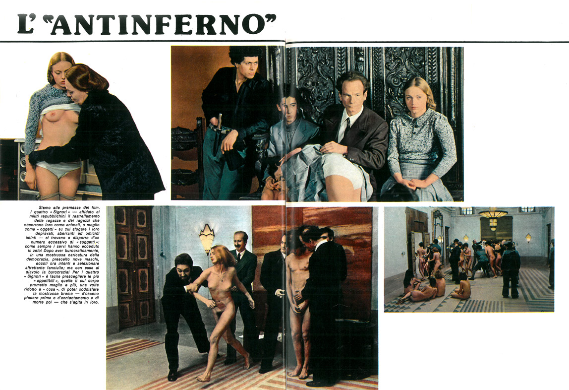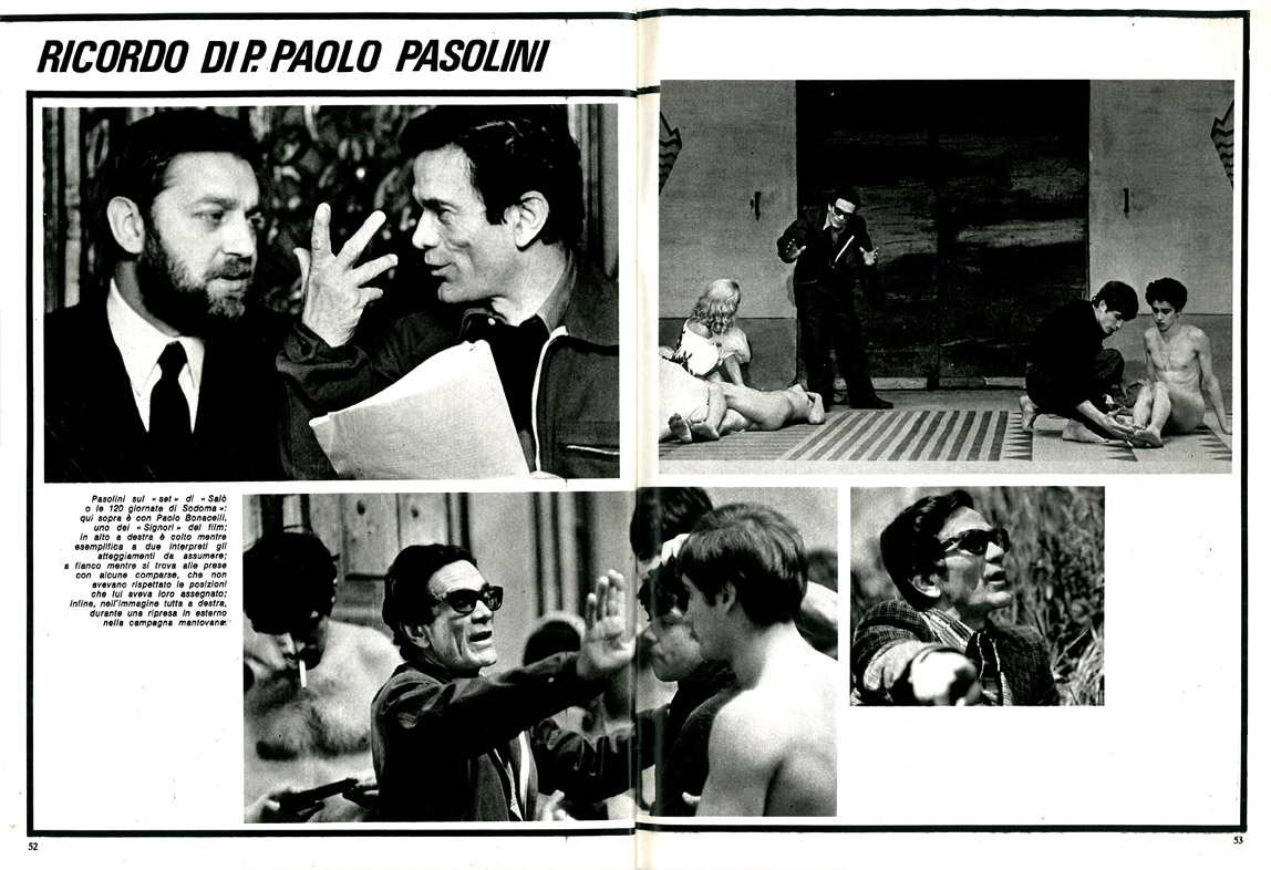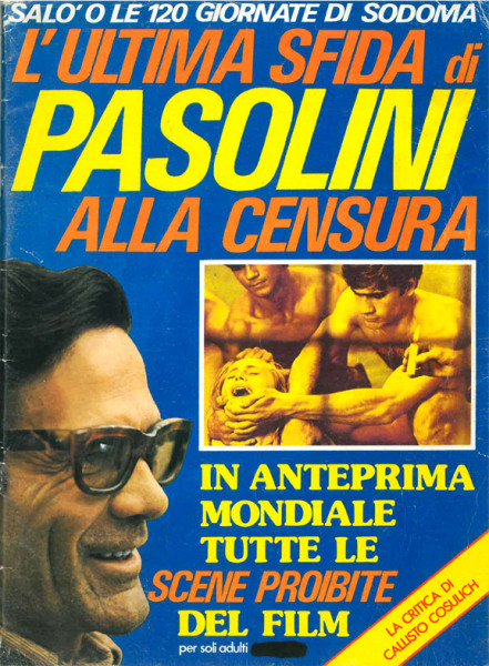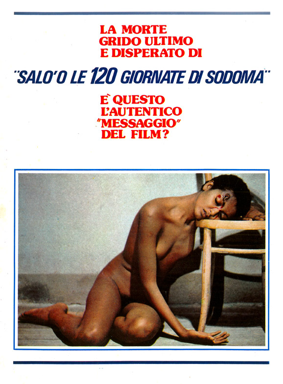 « La sentenza di primo grado è stata emessa mercoledì 12 novembre  a tarda sera: condanna. L’hanno firmata quattro oscuri personaggi: Carlo Di Maio, magistrato di Cassazione, presidente; Pio Fedele, professore di diritto ecclesiastico; Giuseppe Del Buono, in rappresentanza dei produttori cinematografici; il regista Oscar Brazzi (fratello del più noto Rossano) e il giornalista Mario Cessari. Ed è a proposito di questi due ultimi signori che conviene rilevare un particolare di rilievo e sconcertante: né il sindacato autori cinematografici (che dovrebbe essere rappresentato da Oscar Brazzi), né quello dei giornalisti cinematografici (dei quali il Cessari dovrebbe essere un esponente), hanno mai designato alcuno per le commissioni di censura, in quanto i due sindacati contestano «in toto» l’istituto censorio  e ad esso hanno sempre rifiutato ogni collaborazione. E comunque mai avrebbero potuto designare a rappresentarli Brazzi e Cessari, che non figurano tra i loro iscritti. Allora, come sono capitati costoro a far parte dellsa prima commissione di censura, quella che ha giudicato l’opera postuma di Pier Paolo Pasolini? Semplice: il ministero del Turismo e dello Spettacolo dispone di «elenco speciale» di registi e giornalisti, che designa di volta in volta a farnparte delle diverse commissioni. Registi e giornalisti che non fanno parte dei rispettivi sindacati: dei crumiri, insomma. E dei crumiri di modesta specie, visto e considerato che i due sindacati raccolgono tutti – alla lettera – i registi ed i giornalisti specializzati di nome e di prestigio. N’è prova il fatto che il signor Oscar Brazzi, di professione regista cinematografico ma totalmente ignoto al colto come all’inclita, ha al suo “attivo” pellicole del genere di Il sesso del diavolo Intimità proibite d’una giovane sposa, che – a quanto si dice – sono le sue più rimarchevoli. Ed è a un simile personaggio che si permette – ed è a lui che il potere affida il compito – di giudicare un film come Salò o le 120 giornate di Sodoma ! Bene, questi cinqure signori, a nome di tutto il popolo italiano, hanno decretato che l’opera postuma di Pasolini non può essere proiettata in pubblico. Sono essi, per investitura di due ministri democristiani (quello del Turismo e dello Spettacolo e quello della Pubblica Istruzione) i supremi garanti che il «pudore» degli italiani, il «pudore» mio, tuo, nostro, di tutti noi maggiorenni ed extra-maggiorenni, non verrà «offeso» da Pasolini «post-mortem». Essi hanno visto con i nostri occhi, hanno ascoltato con le nostre orecchie, hanno arrossito con le nostre gote, si sono scandalizzati con le nostre coscienze, hanno pensato con i nostri cervelli; ma non è chiaro con quale parte di noi abbiano deciso. Ma hanno deciso, e la loro decisione è valida per tutti noi. Per tutti noi che siamo riytenuti in grado di stabilire, con  il voto, a chi affidare le sorti nostre e del Paese, ma no tanto adulti da poter assistere alla proiezione di un film e giudicarlo in base ai suoi valori e alla nostra cultura. No: per questo abbiamo bisogno dei tutori. Assurda, ridicola contraddizione! La gravità del provvedimento è stata subito colta praticamente dalla totalità del Paese: la stampa senza eccezioni (anche quella di destra s’è questa volta unita al coro delle proteste: basti ricordare quanto hanno scritto in proposito «Il Giornale d’Italia», «Il Settimanale» e «Il Giornale»), personalità e partiti politici, autori di cinema, uomini di cultura, magistrati, fanno eco ad Alberto Grimaldi, produttore di «Salò-Sodoma», il quale – non appena appreso il rifiuto del «nulla-osta» al film – non esita a dichiarare che aberrante non è l’opera di Pasolini ma quanto hanno decretato i censori. (segue la presentazione dei contenuti della rivista) »
