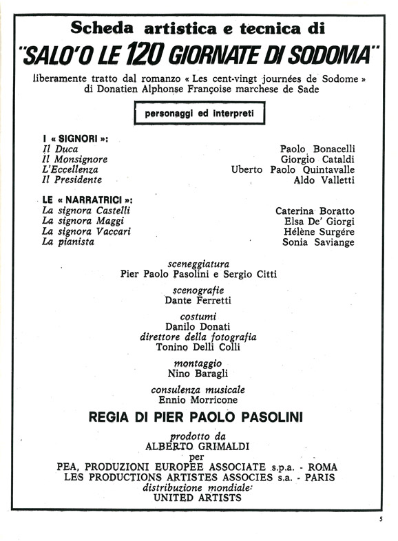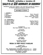 Note su  Sade, sulla vita e le opere di Pasolini, sugli interpreti principali del film (biografia e foto) e una sequenza fotografica di Pasolini sul set di Salò o le 120 giornate di Sodoma (vedi in GALLERY) intitolata «Ricordo di Pier Paolo Pasolini»