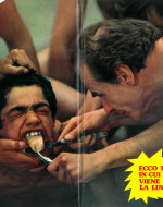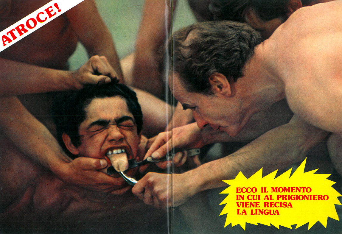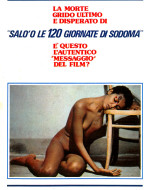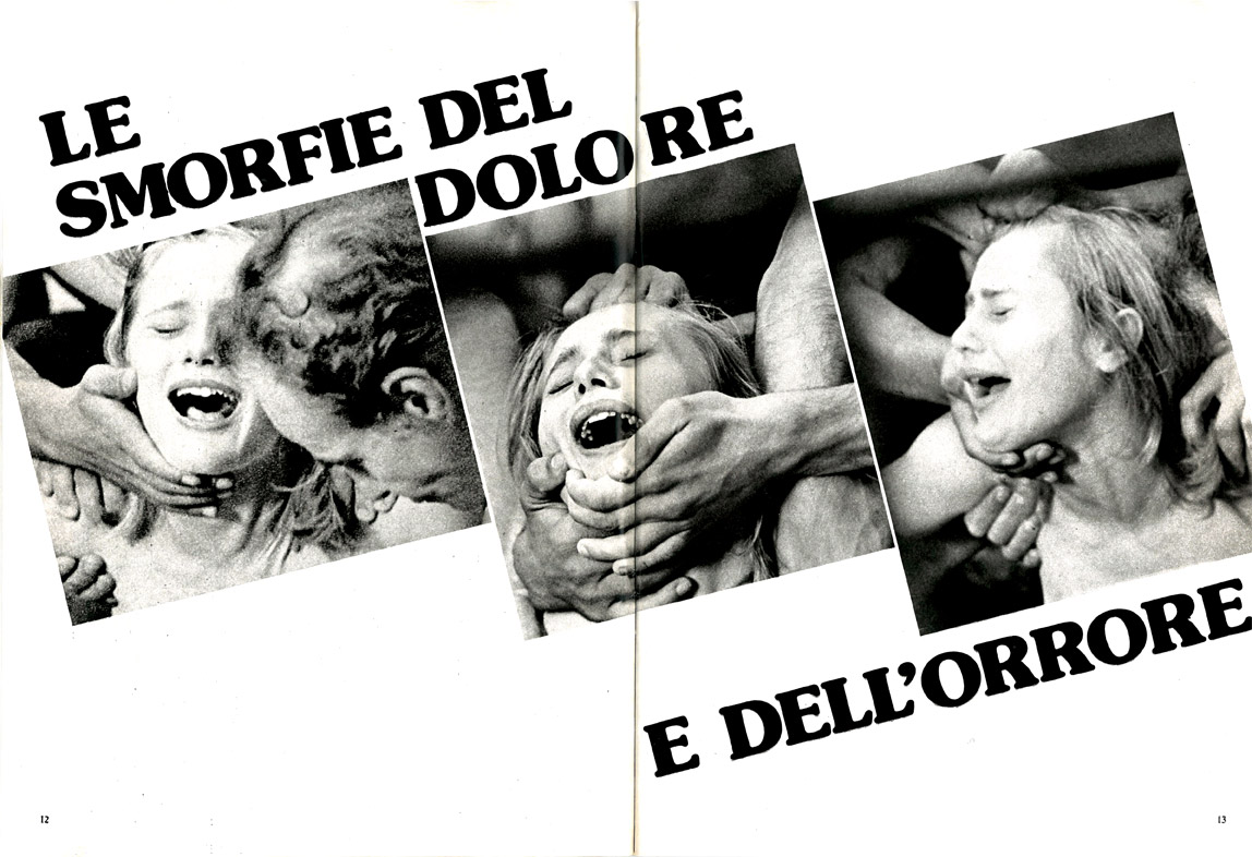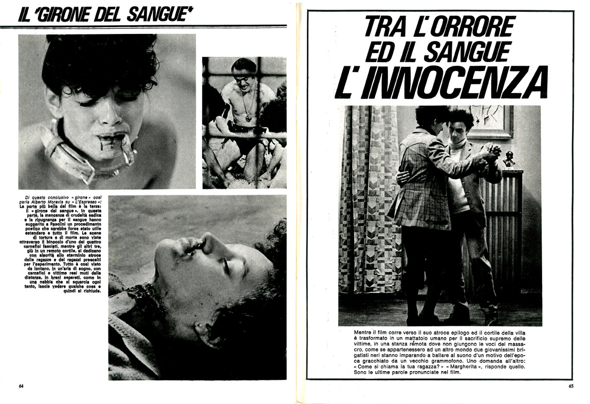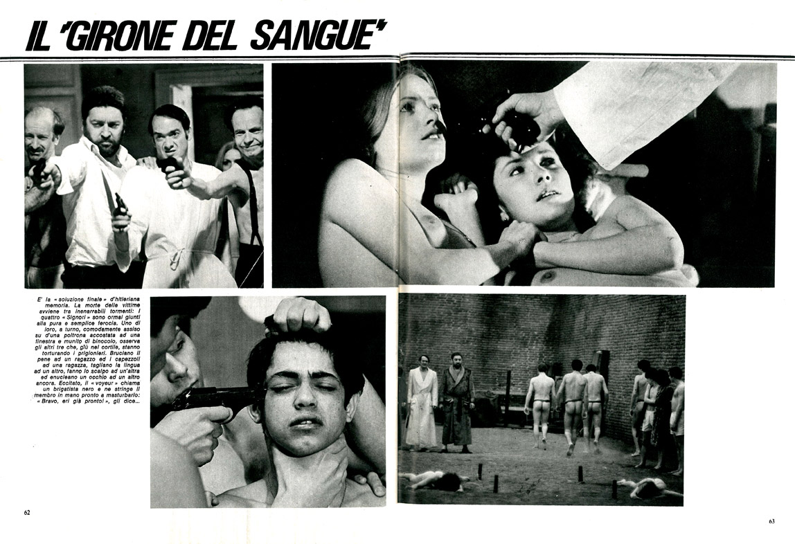Le “immagini dell’orrore” (sequenza fotografica di alcune scene del film, in particolare quelle relative alle torture del conclusivo Terzo Girone del Sangue e alcune del Secondo Girone della Merda). Ogni composizione fotografica, in bianco e nero e a colori, è commentata da didascalie scandalistiche (vedi alcuni esempi nella GALLERY di questa scheda)