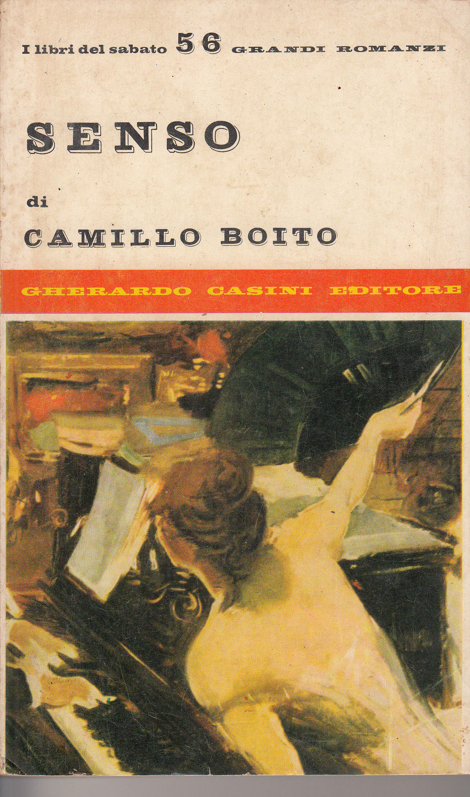 ♦ Camillo Boito, SENSO E ALTRE STORIE ( Novelle: Senso / Il maestro di setticlavio / Baciale ‘l piede e la man bella e bianca / Un corpo ). Roma, Gherardo Casini Editore, Collana «I Libri del Sabato – Grandi Romanzi», n.56, dicembre 1956. Brossura a colori illustrata da un particolare di Ritratto di signora di Giovanni Boldini. Pp. 192. Cm. 18, 5 x 11.